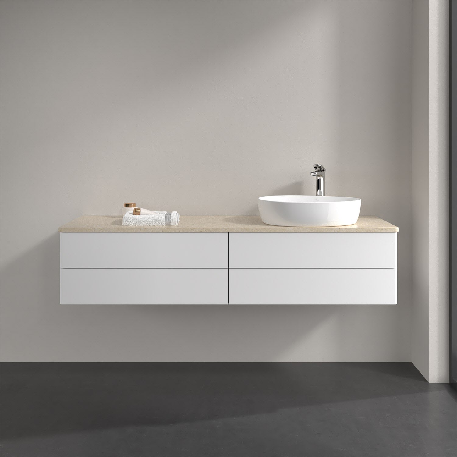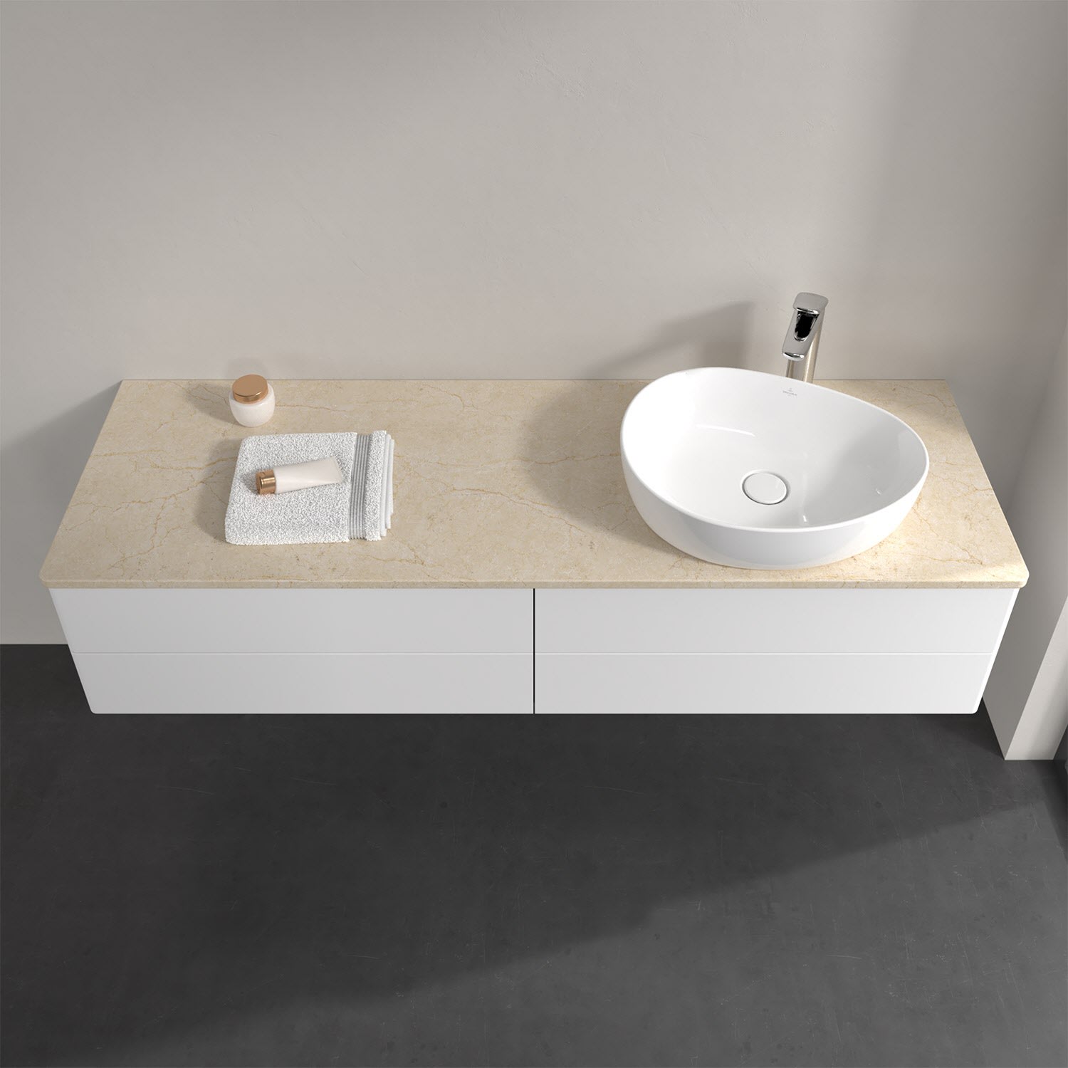 Für diesen Waschbeckenunterschrank stehen Ihnen Aufsatzwaschtische aus verschiedenen Serien zur Verfügung (siehe "Passliste" unter Downloads). Ein ausgewähltes Beispiel finden Sie im Zubehör. Den Waschtisch bitte separat mitbestellen.