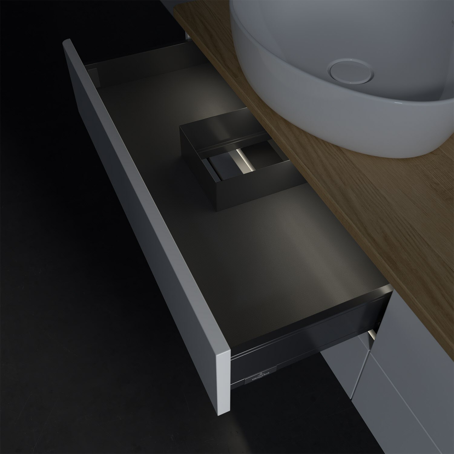 - in Schublade integrierte LED-Leiste mit warmweißem Licht zur Beleuchtung des Innenlebens