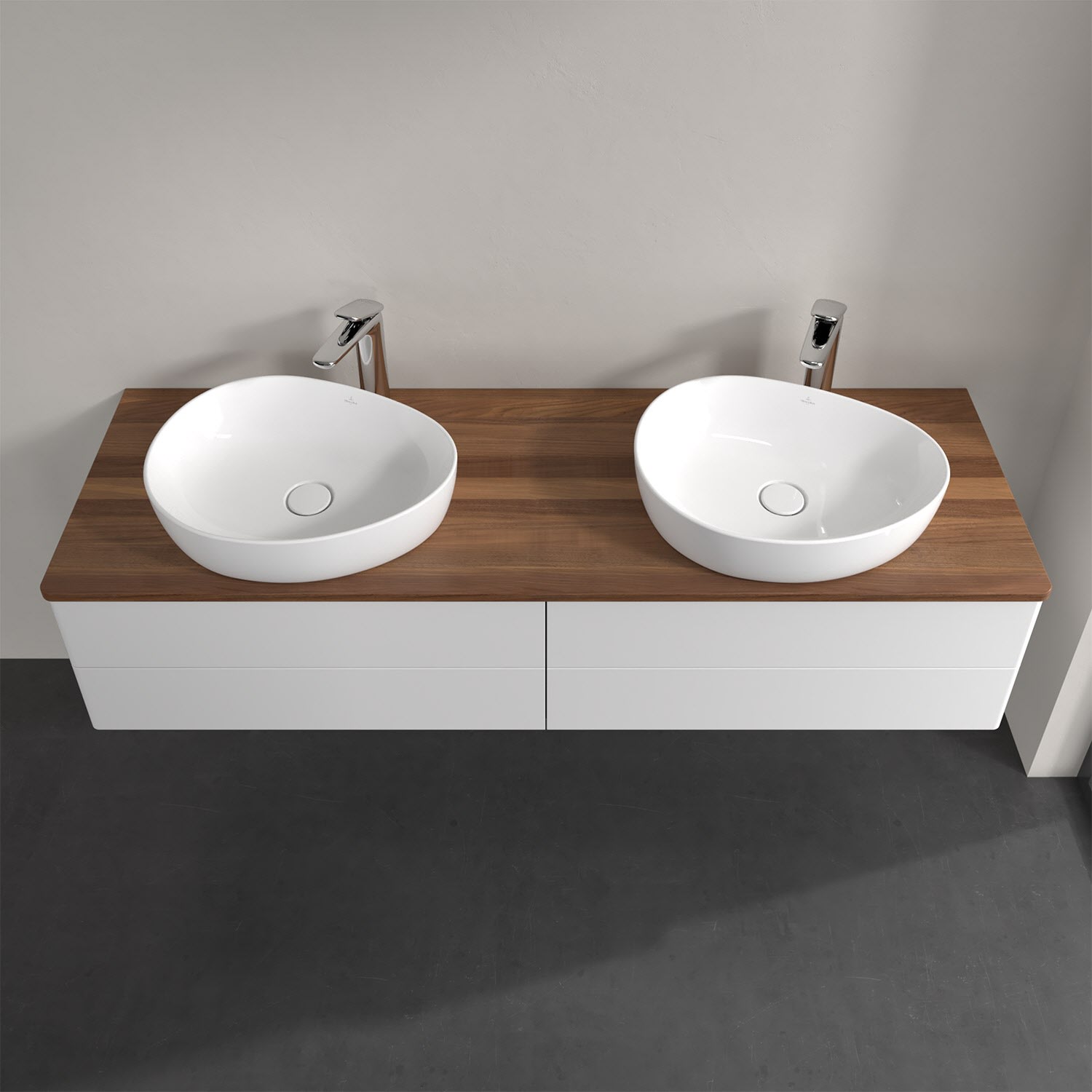 Der wandhängende Antao Waschtischunterschrank für zwei Aufsatzwaschtische bietet mit seinen vier Auszügen und seiner erstaunlichen Größe viel Platz zum Verstauen von Utensilien im Badezimmer. Inspiriert von der Natur überzeugt der Unterschrank auch optisch mit sanfter Formsprache und abgerundete Kanten. Die grifflosen Auszüge sind mit der Push-to-Open Funktion ausgestattet und verfügen über einen Antirutschboden, damit Utensilien sicher verstaut werden können. Den Überblick behält man dank der warmweißen Auszugsbeleuchtung, die sich automatisch beim Öffnen einschaltet. Mit seiner Vollauszug- und Selbsteinzug-Funktion ist der Schrank praktisch und leicht zu bedienen. Qualität von Villeroy & Boch! Für eine besonders leichte Pflege sorgt die mehrschichtig deckend lackierte Oberfläche. Bei der Ausführung in Massivholz wird dank des verarbeiteten Massivholzes jedes Möbel zu einem Unikat, das sich durch das lebendige Naturmaterial durch seine einzigartige Struktur und Maserung auszeichnet.