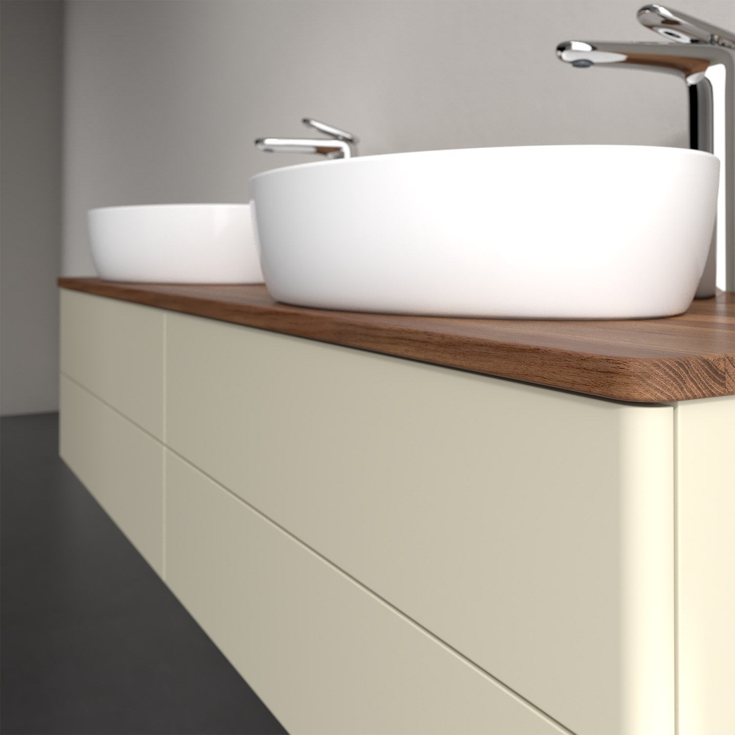 Der wandhängende Antao Waschtischunterschrank für zwei Aufsatzwaschtische bietet mit seinen vier Auszügen und seiner erstaunlichen Größe viel Platz zum Verstauen von Utensilien im Badezimmer. Inspiriert von der Natur überzeugt der Unterschrank auch optisch mit sanfter Formsprache und abgerundete Kanten. Die grifflosen Auszüge sind mit der Push-to-Open Funktion ausgestattet und verfügen über einen Antirutschboden, damit Utensilien sicher verstaut werden können. Den Überblick behält man dank der warmweißen Auszugsbeleuchtung, die sich automatisch beim Öffnen einschaltet. Mit seiner Vollauszug- und Selbsteinzug-Funktion ist der Schrank praktisch und leicht zu bedienen. Qualität von Villeroy & Boch! Für eine besonders leichte Pflege sorgt die mehrschichtig deckend lackierte Oberfläche. Bei der Ausführung in Massivholz wird dank des verarbeiteten Massivholzes jedes Möbel zu einem Unikat, das sich durch das lebendige Naturmaterial durch seine einzigartige Struktur und Maserung auszeichnet.