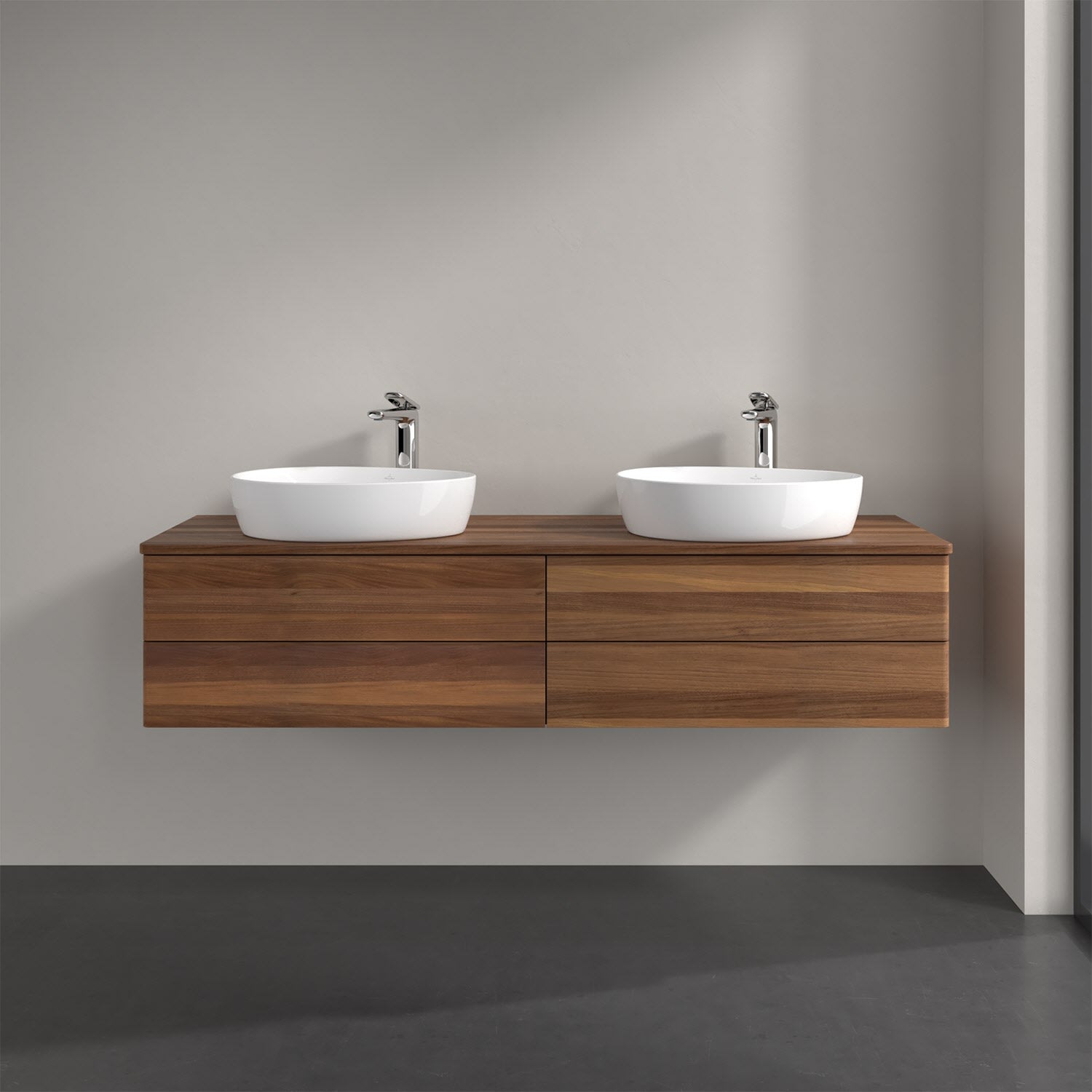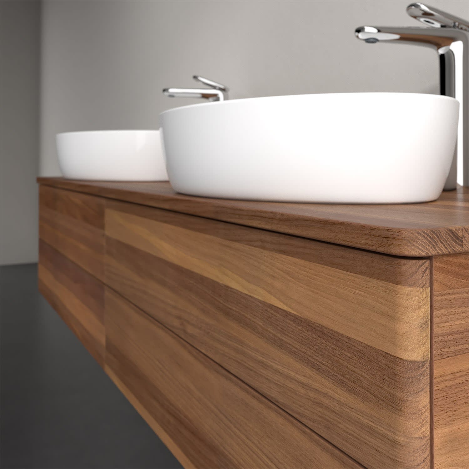 Der wandhängende Antao Waschtischunterschrank für zwei Aufsatzwaschtische bietet mit seinen vier Auszügen und seiner erstaunlichen Größe viel Platz zum Verstauen von Utensilien im Badezimmer. Inspiriert von der Natur überzeugt der Unterschrank auch optisch mit sanfter Formsprache und abgerundete Kanten. Die grifflosen Auszüge sind mit der Push-to-Open Funktion ausgestattet und verfügen über einen Antirutschboden, damit Utensilien sicher verstaut werden können. Den Überblick behält man dank der warmweißen Auszugsbeleuchtung, die sich automatisch beim Öffnen einschaltet. Mit seiner Vollauszug- und Selbsteinzug-Funktion ist der Schrank praktisch und leicht zu bedienen. Qualität von Villeroy & Boch! Für eine besonders leichte Pflege sorgt die mehrschichtig deckend lackierte Oberfläche. Bei der Ausführung in Massivholz wird dank des verarbeiteten Massivholzes jedes Möbel zu einem Unikat, das sich durch das lebendige Naturmaterial durch seine einzigartige Struktur und Maserung auszeichnet.