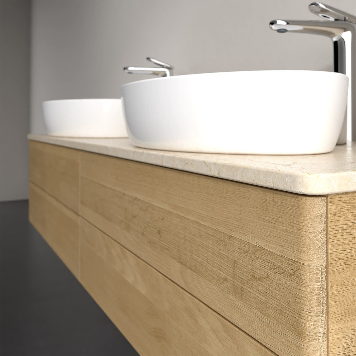 Der wandhängende Antao Waschtischunterschrank für zwei Aufsatzwaschtische bietet mit seinen vier Auszügen und seiner erstaunlichen Größe viel Platz zum Verstauen von Utensilien im Badezimmer. Inspiriert von der Natur überzeugt der Unterschrank auch optisch mit sanfter Formsprache und abgerundete Kanten. Die grifflosen Auszüge sind mit der Push-to-Open Funktion ausgestattet und verfügen über einen Antirutschboden, damit Utensilien sicher verstaut werden können. Den Überblick behält man dank der warmweißen Auszugsbeleuchtung, die sich automatisch beim Öffnen einschaltet. Mit seiner Vollauszug- und Selbsteinzug-Funktion ist der Schrank praktisch und leicht zu bedienen. Qualität von Villeroy & Boch! Für eine besonders leichte Pflege sorgt die mehrschichtig deckend lackierte Oberfläche. Bei der Ausführung in Massivholz wird dank des verarbeiteten Massivholzes jedes Möbel zu einem Unikat, das sich durch das lebendige Naturmaterial durch seine einzigartige Struktur und Maserung auszeichnet.