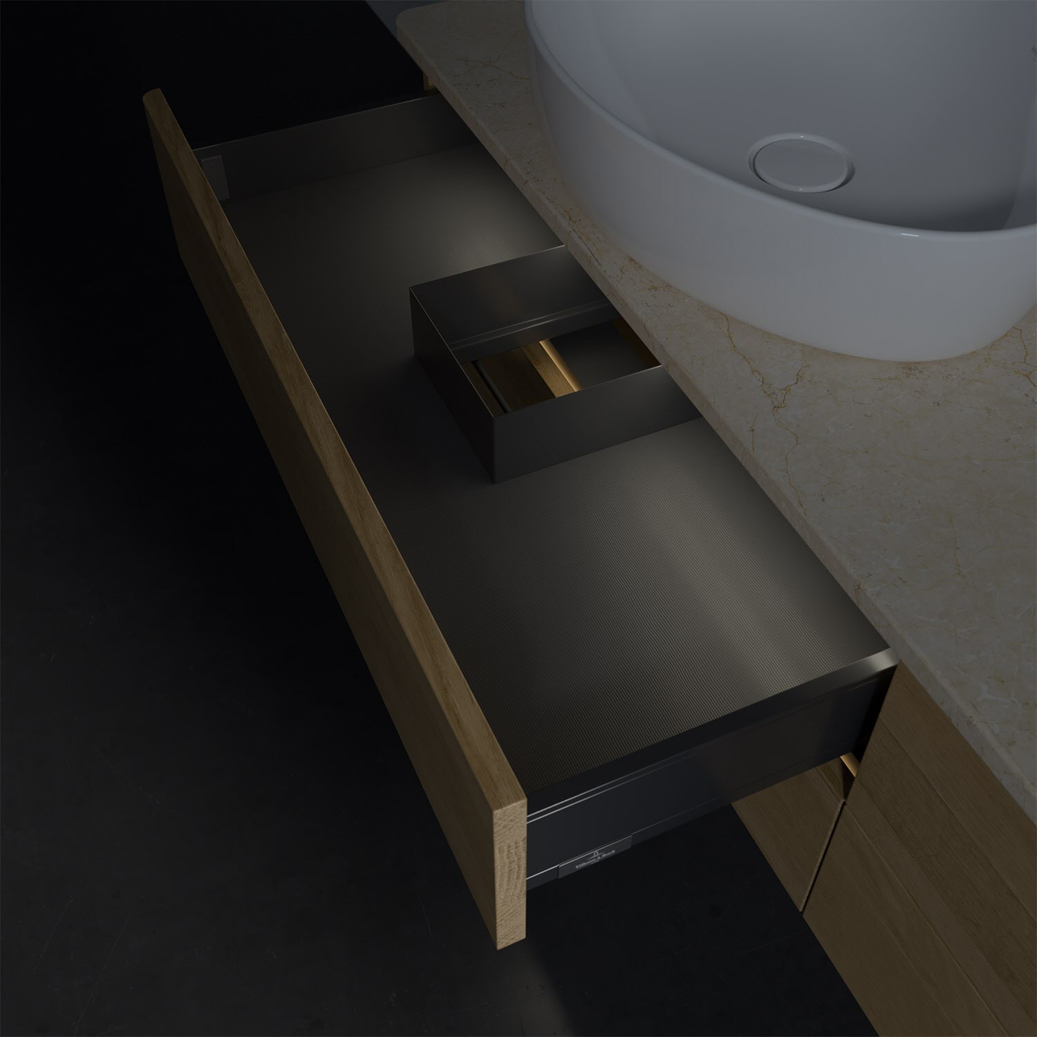 - in Schublade integrierte LED-Leiste mit warmweißem Licht zur Beleuchtung des Innenlebens