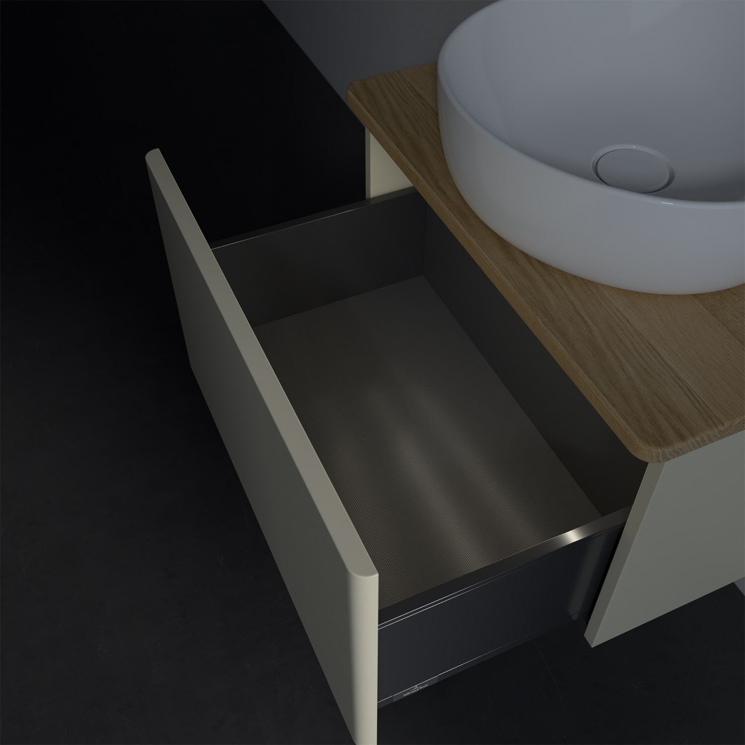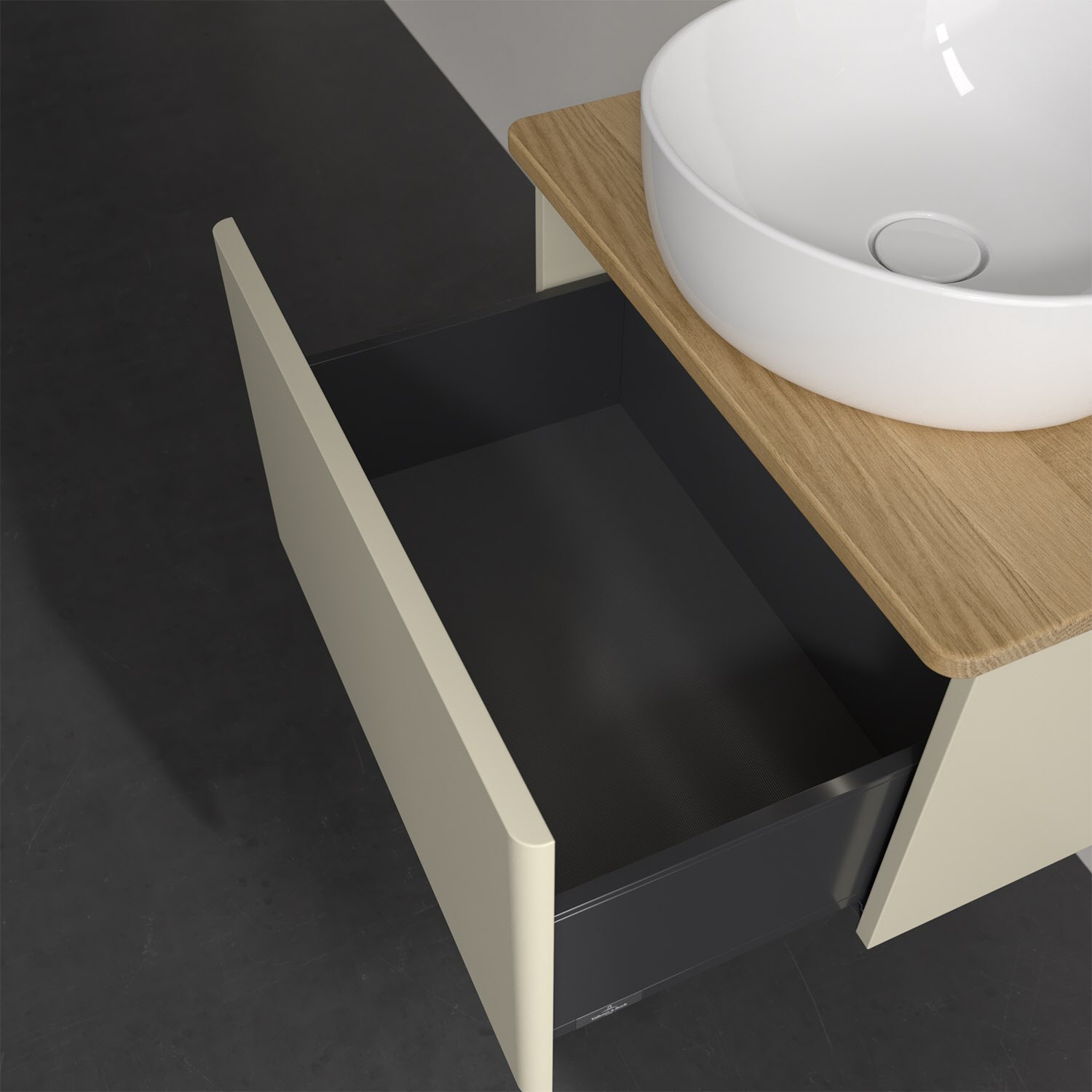 Wenig Platz im Badezimmer und dennoch soll es gemütlich und ordentlich sein? Dann ist der wandhängende Antao Waschtischunterschrank mit seinen sanft abgerundeten Kanten die ideale Lösung. Das geräumige Möbel bietet ausreichend Stauraum für alle nötigen Badutensilien. Zum Öffnen genügt dank der Push-to-Open Funktion ein leichter Druck auf den extra hohen Auszug, der sich dann in seiner vollen Tiefe öffnet. Dabei wird gleichzeitig die angenehme Auszugsbeleuchtung in Warmweiß aktiviert. Das garantiert den benötigen Überblick! Praktisch ist auch der integrierte Antirutschboden und die SoftClosing Funktion, die ein Umfallen oder Verrutschen der verstauten Produkte verhindern. Villeroy & Boch hat alles durchdacht! Für eine besonders leichte Pflege sorgt die mehrschichtig deckend lackierte Oberfläche. Bei der Ausführung in Massivholz wird dank des verarbeiteten Massivholzes jedes Möbel zu einem Unikat, das sich durch das lebendige Naturmaterial durch seine einzigartige Struktur und Maserung auszeichnet.
