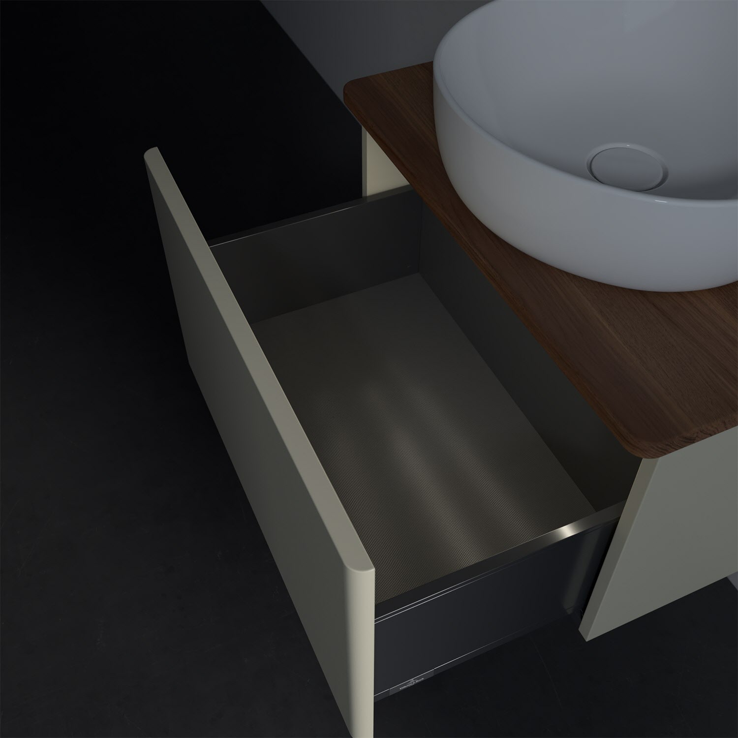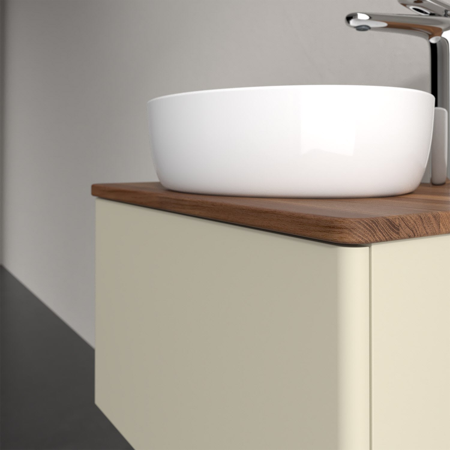 Wenig Platz im Badezimmer und dennoch soll es gemütlich und ordentlich sein? Dann ist der wandhängende Antao Waschtischunterschrank mit seinen sanft abgerundeten Kanten die ideale Lösung. Das geräumige Möbel bietet ausreichend Stauraum für alle nötigen Badutensilien. Zum Öffnen genügt dank der Push-to-Open Funktion ein leichter Druck auf den extra hohen Auszug, der sich dann in seiner vollen Tiefe öffnet. Dabei wird gleichzeitig die angenehme Auszugsbeleuchtung in Warmweiß aktiviert. Das garantiert den benötigen Überblick! Praktisch ist auch der integrierte Antirutschboden und die SoftClosing Funktion, die ein Umfallen oder Verrutschen der verstauten Produkte verhindern. Villeroy & Boch hat alles durchdacht! Für eine besonders leichte Pflege sorgt die mehrschichtig deckend lackierte Oberfläche. Bei der Ausführung in Massivholz wird dank des verarbeiteten Massivholzes jedes Möbel zu einem Unikat, das sich durch das lebendige Naturmaterial durch seine einzigartige Struktur und Maserung auszeichnet.