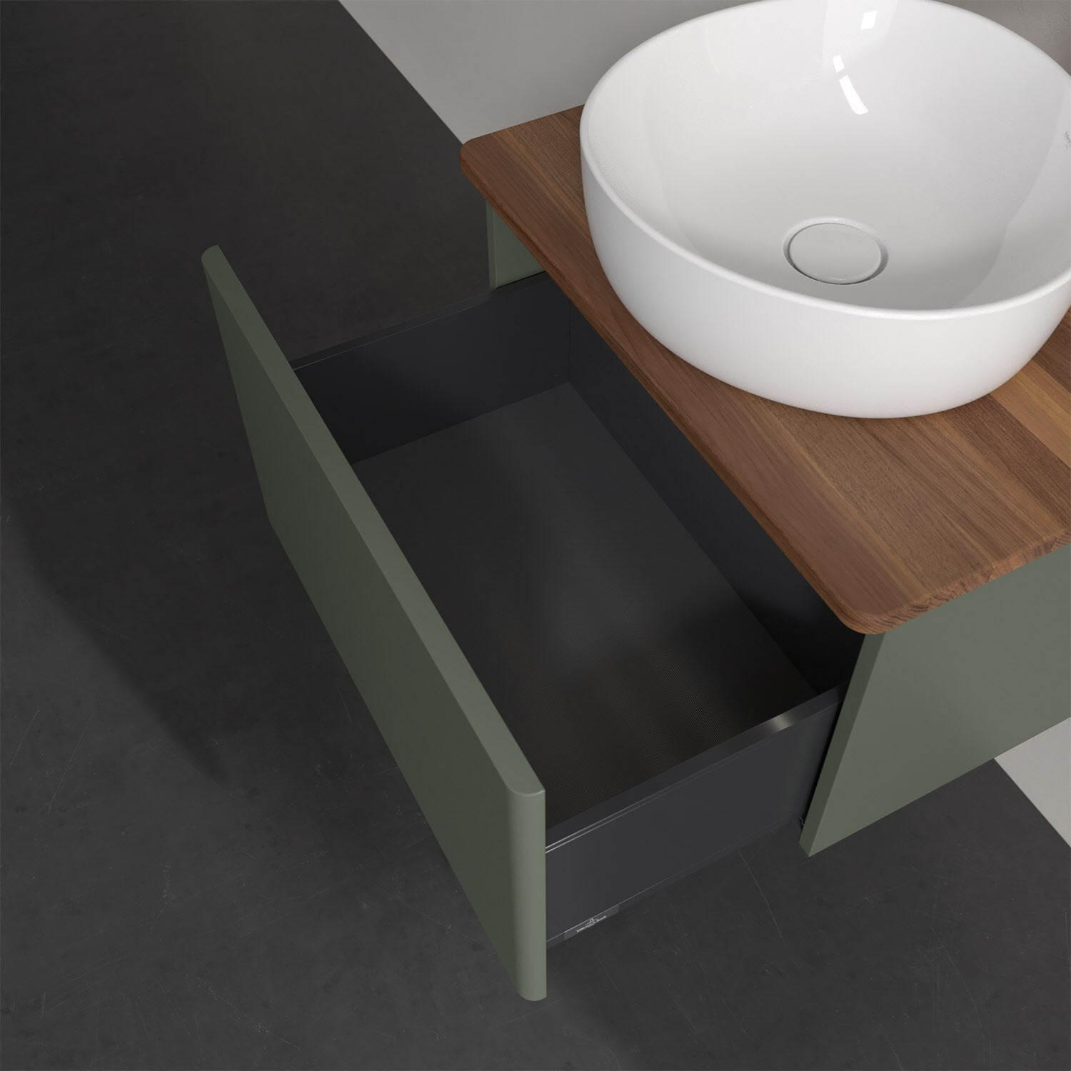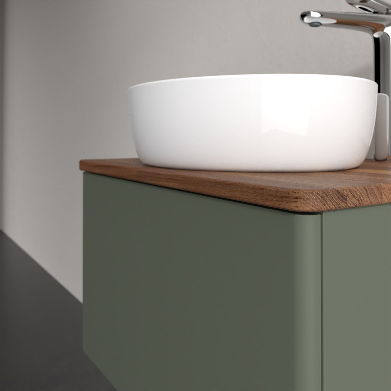 Wenig Platz im Badezimmer und dennoch soll es gemütlich und ordentlich sein? Dann ist der wandhängende Antao Waschtischunterschrank mit seinen sanft abgerundeten Kanten die ideale Lösung. Das geräumige Möbel bietet ausreichend Stauraum für alle nötigen Badutensilien. Zum Öffnen genügt dank der Push-to-Open Funktion ein leichter Druck auf den extra hohen Auszug, der sich dann in seiner vollen Tiefe öffnet. Dabei wird gleichzeitig die angenehme Auszugsbeleuchtung in Warmweiß aktiviert. Das garantiert den benötigen Überblick! Praktisch ist auch der integrierte Antirutschboden und die SoftClosing Funktion, die ein Umfallen oder Verrutschen der verstauten Produkte verhindern. Villeroy & Boch hat alles durchdacht! Für eine besonders leichte Pflege sorgt die mehrschichtig deckend lackierte Oberfläche. Bei der Ausführung in Massivholz wird dank des verarbeiteten Massivholzes jedes Möbel zu einem Unikat, das sich durch das lebendige Naturmaterial durch seine einzigartige Struktur und Maserung auszeichnet.