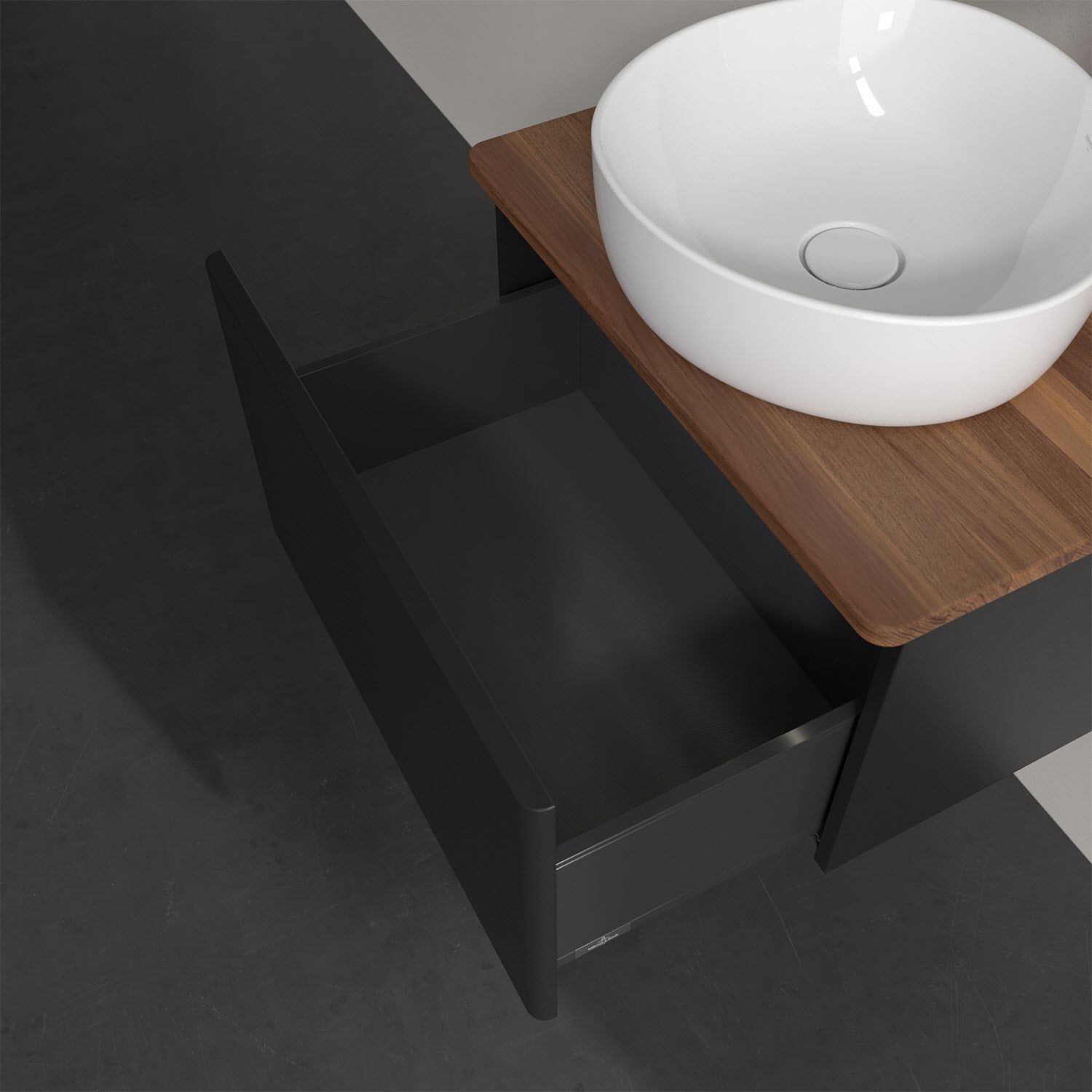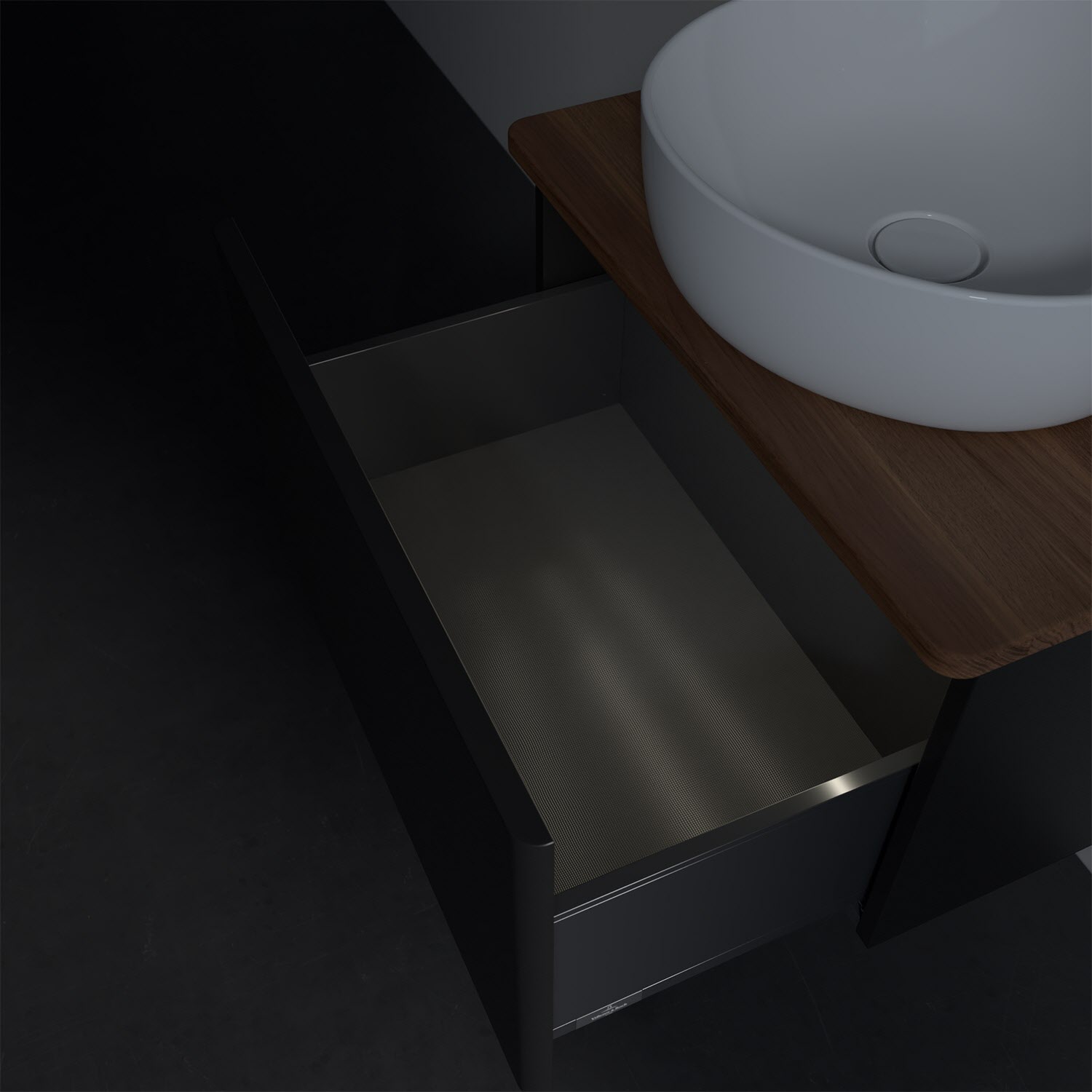 Wenig Platz im Badezimmer und dennoch soll es gemütlich und ordentlich sein? Dann ist der wandhängende Antao Waschtischunterschrank mit seinen sanft abgerundeten Kanten die ideale Lösung. Das geräumige Möbel bietet ausreichend Stauraum für alle nötigen Badutensilien. Zum Öffnen genügt dank der Push-to-Open Funktion ein leichter Druck auf den extra hohen Auszug, der sich dann in seiner vollen Tiefe öffnet. Dabei wird gleichzeitig die angenehme Auszugsbeleuchtung in Warmweiß aktiviert. Das garantiert den benötigen Überblick! Praktisch ist auch der integrierte Antirutschboden und die SoftClosing Funktion, die ein Umfallen oder Verrutschen der verstauten Produkte verhindern. Villeroy & Boch hat alles durchdacht! Für eine besonders leichte Pflege sorgt die mehrschichtig deckend lackierte Oberfläche. Bei der Ausführung in Massivholz wird dank des verarbeiteten Massivholzes jedes Möbel zu einem Unikat, das sich durch das lebendige Naturmaterial durch seine einzigartige Struktur und Maserung auszeichnet.