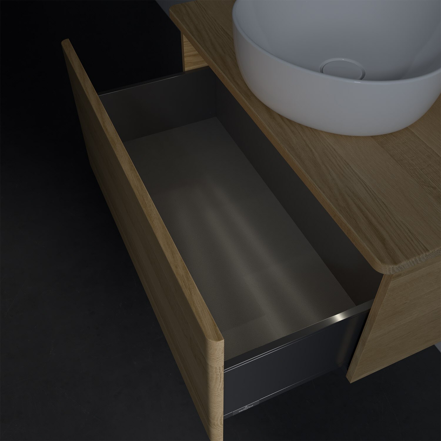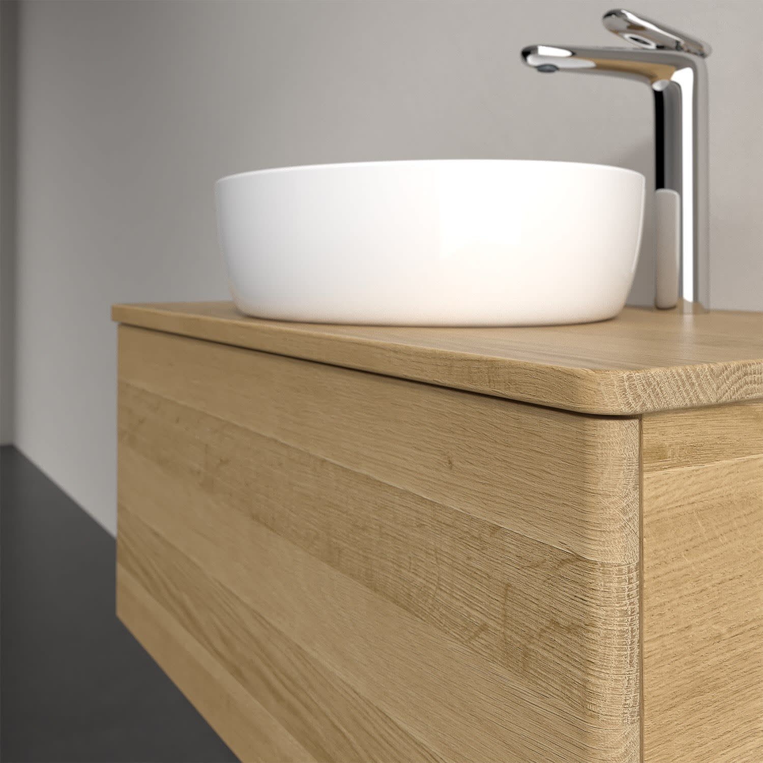 Mit dem wandhängenden Waschtischunterschrank der Kollektion Antao wird ein natürliches und gemütliches Flair am Waschplatz geschaffen. Dafür sorgen die sanfte Formsprache und die abgerundete Kanten des hochwertigen Badmöbels. Die wichtigsten Badutensilien für die tägliche Routine können seitlich des Waschtischs auf die Waschtischplatte gestellt werden. Ansonsten bietet ein extra hoher Auszug inklusive warmweißer Beleuchtung und Antirutschboden ausreichend Platz für weitere Produkte, die garantiert bleiben, wo sie hingehören. Der Unterschrank verfügt zudem über einen Vollauszug und Selbsteinzug mit SoftClosing Funktion, damit er bequem und mühelos geöffnet und geschlossen werden kann. Gewohnte Qualität von Villeroy & Boch! Für eine besonders leichte Pflege sorgt die mehrschichtig deckend lackierte Oberfläche. Bei der Ausführung in Massivholz wird dank des verarbeiteten Massivholzes jedes Möbel zu einem Unikat, das sich durch das lebendige Naturmaterial durch seine einzigartige Struktur und Maserung auszeichnet.