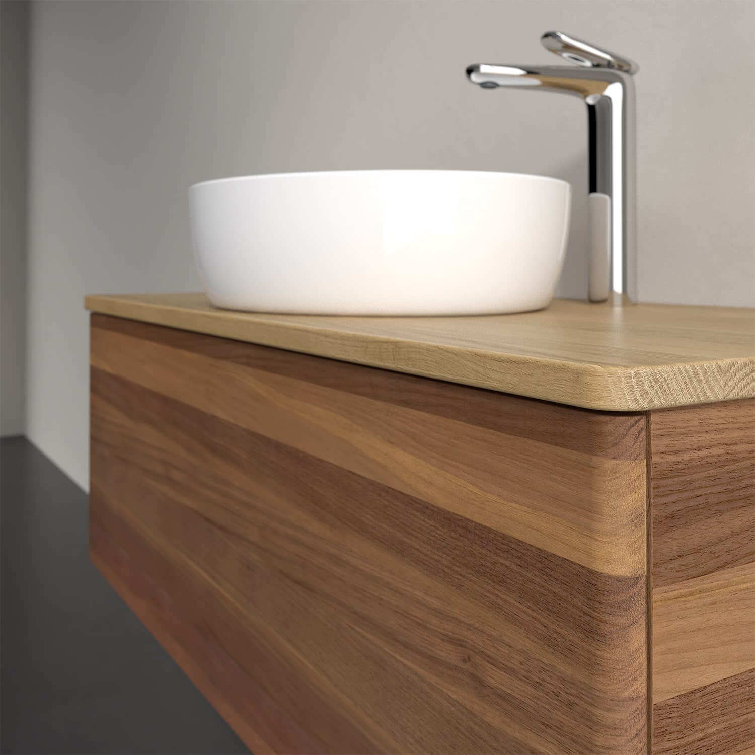 Mit dem wandhängenden Antao Waschtischunterschrank entscheidet man sich für eine hochwertige und praktische Stauraumlösung, die viel Freude bereitet. Die Funktionen sind besonders gut durchdacht: Im Inneren der beiden extra hohen und vollausziehbaren Auszüge können Handtücher, Kosmetik oder andere Pflegeprodukte dank des Antirutschbodens bequem aufbewahrt werden. Geöffnet wird das Möbel durch leichten Druck auf die grifflose Front. Der Clou: Dabei schaltet sich die warmweiße Auszugsbeleuchtung ein. Natürlich verfügen die Auszüge über eingebaute Dämpfer, die sie anschließend wieder sanft und leise schließen lassen. Auch auf der Waschtischplatte finden die wichtigsten Utensilien seitlich des Waschtischs genügend Platz. Optisch sorgt der Unterschrank von Villeroy & Boch mit seinen abgerundeten Kanten für ein modernes, gemütliches Ambiente. Für eine besonders leichte Pflege sorgt die mehrschichtig deckend lackierte Oberfläche. Bei der Ausführung in Massivholz wird dank des verarbeiteten Massivholzes jedes Möbel zu einem Unikat, das sich durch das lebendige Naturmaterial durch seine einzigartige Struktur und Maserung auszeichnet.