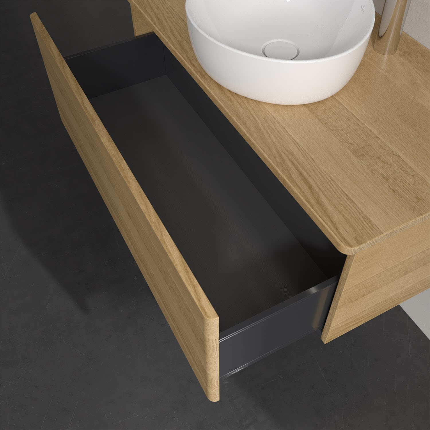 - kein Umfallen oder Verrutschen von Pflegeprodukten in den Schubladen dank rutschhemmendem Boden