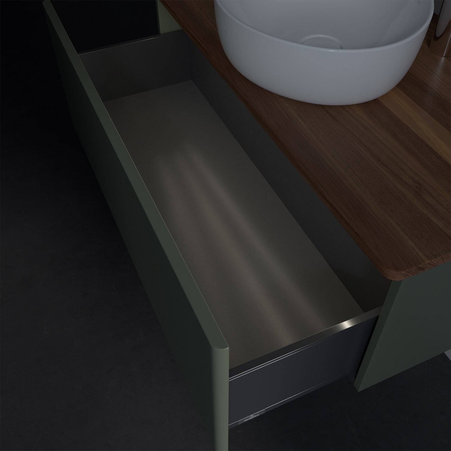 Mit dem wandhängenden Antao Waschtischunterschrank entscheidet man sich für eine hochwertige und praktische Stauraumlösung, die viel Freude bereitet. Die Funktionen sind besonders gut durchdacht: Im Inneren der beiden extra hohen und vollausziehbaren Auszüge können Handtücher, Kosmetik oder andere Pflegeprodukte dank des Antirutschbodens bequem aufbewahrt werden. Geöffnet wird das Möbel durch leichten Druck auf die grifflose Front. Der Clou: Dabei schaltet sich die warmweiße Auszugsbeleuchtung ein. Natürlich verfügen die Auszüge über eingebaute Dämpfer, die sie anschließend wieder sanft und leise schließen lassen. Auch auf der Waschtischplatte finden die wichtigsten Utensilien seitlich des Waschtischs genügend Platz. Optisch sorgt der Unterschrank von Villeroy & Boch mit seinen abgerundeten Kanten für ein modernes, gemütliches Ambiente. Für eine besonders leichte Pflege sorgt die mehrschichtig deckend lackierte Oberfläche. Bei der Ausführung in Massivholz wird dank des verarbeiteten Massivholzes jedes Möbel zu einem Unikat, das sich durch das lebendige Naturmaterial durch seine einzigartige Struktur und Maserung auszeichnet.