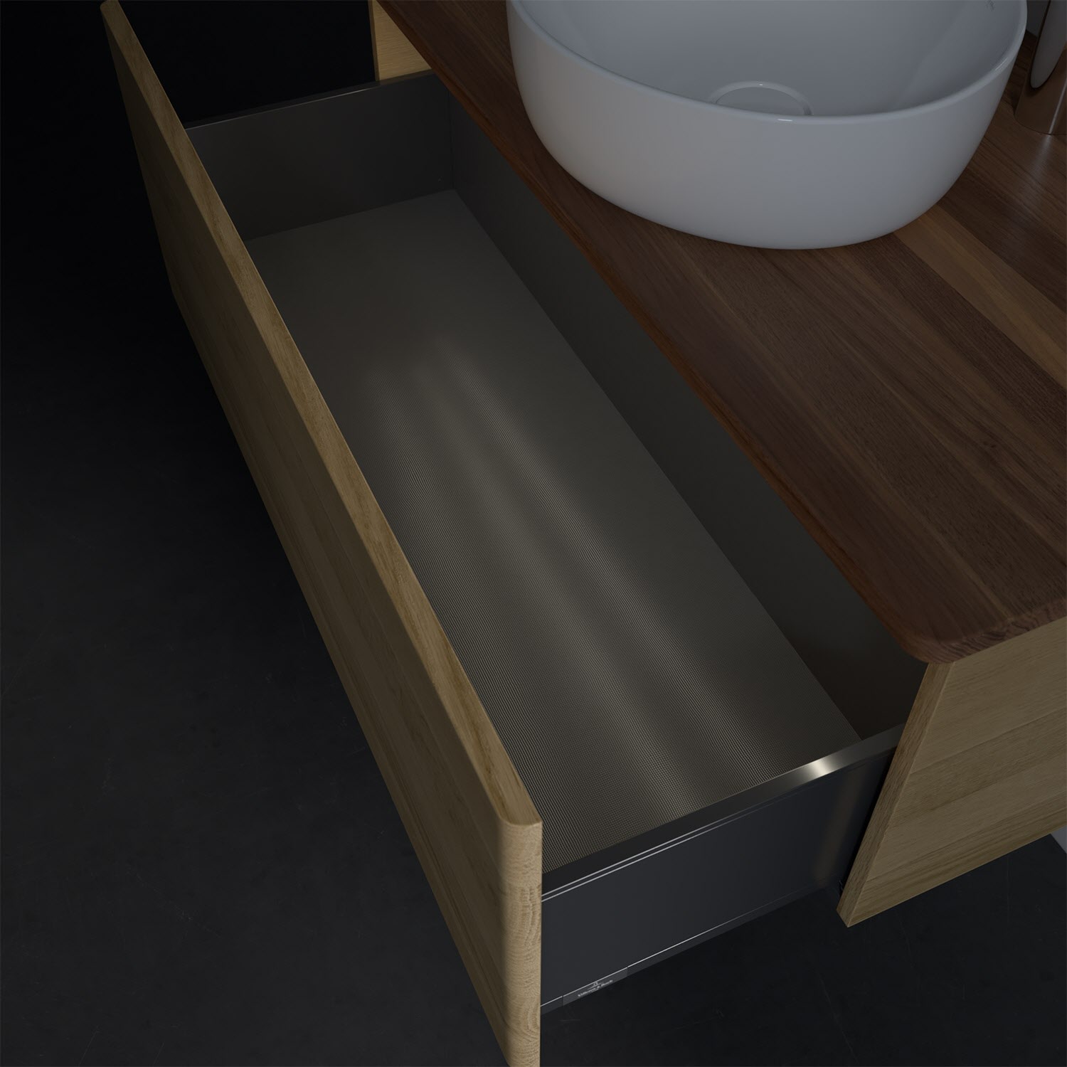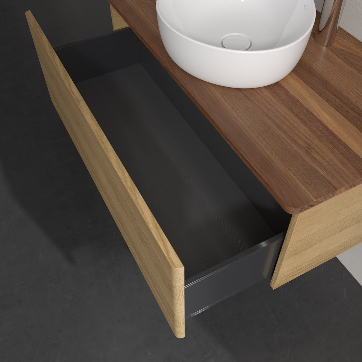Mit dem wandhängenden Antao Waschtischunterschrank entscheidet man sich für eine hochwertige und praktische Stauraumlösung, die viel Freude bereitet. Die Funktionen sind besonders gut durchdacht: Im Inneren der beiden extra hohen und vollausziehbaren Auszüge können Handtücher, Kosmetik oder andere Pflegeprodukte dank des Antirutschbodens bequem aufbewahrt werden. Geöffnet wird das Möbel durch leichten Druck auf die grifflose Front. Der Clou: Dabei schaltet sich die warmweiße Auszugsbeleuchtung ein. Natürlich verfügen die Auszüge über eingebaute Dämpfer, die sie anschließend wieder sanft und leise schließen lassen. Auch auf der Waschtischplatte finden die wichtigsten Utensilien seitlich des Waschtischs genügend Platz. Optisch sorgt der Unterschrank von Villeroy & Boch mit seinen abgerundeten Kanten für ein modernes, gemütliches Ambiente. Für eine besonders leichte Pflege sorgt die mehrschichtig deckend lackierte Oberfläche. Bei der Ausführung in Massivholz wird dank des verarbeiteten Massivholzes jedes Möbel zu einem Unikat, das sich durch das lebendige Naturmaterial durch seine einzigartige Struktur und Maserung auszeichnet.