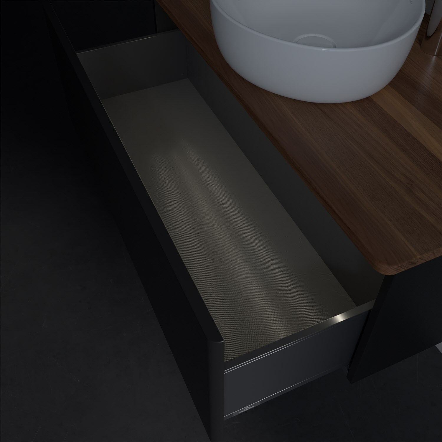 Mit dem wandhängenden Antao Waschtischunterschrank entscheidet man sich für eine hochwertige und praktische Stauraumlösung, die viel Freude bereitet. Die Funktionen sind besonders gut durchdacht: Im Inneren der beiden extra hohen und vollausziehbaren Auszüge können Handtücher, Kosmetik oder andere Pflegeprodukte dank des Antirutschbodens bequem aufbewahrt werden. Geöffnet wird das Möbel durch leichten Druck auf die grifflose Front. Der Clou: Dabei schaltet sich die warmweiße Auszugsbeleuchtung ein. Natürlich verfügen die Auszüge über eingebaute Dämpfer, die sie anschließend wieder sanft und leise schließen lassen. Auch auf der Waschtischplatte finden die wichtigsten Utensilien seitlich des Waschtischs genügend Platz. Optisch sorgt der Unterschrank von Villeroy & Boch mit seinen abgerundeten Kanten für ein modernes, gemütliches Ambiente. Für eine besonders leichte Pflege sorgt die mehrschichtig deckend lackierte Oberfläche. Bei der Ausführung in Massivholz wird dank des verarbeiteten Massivholzes jedes Möbel zu einem Unikat, das sich durch das lebendige Naturmaterial durch seine einzigartige Struktur und Maserung auszeichnet.
