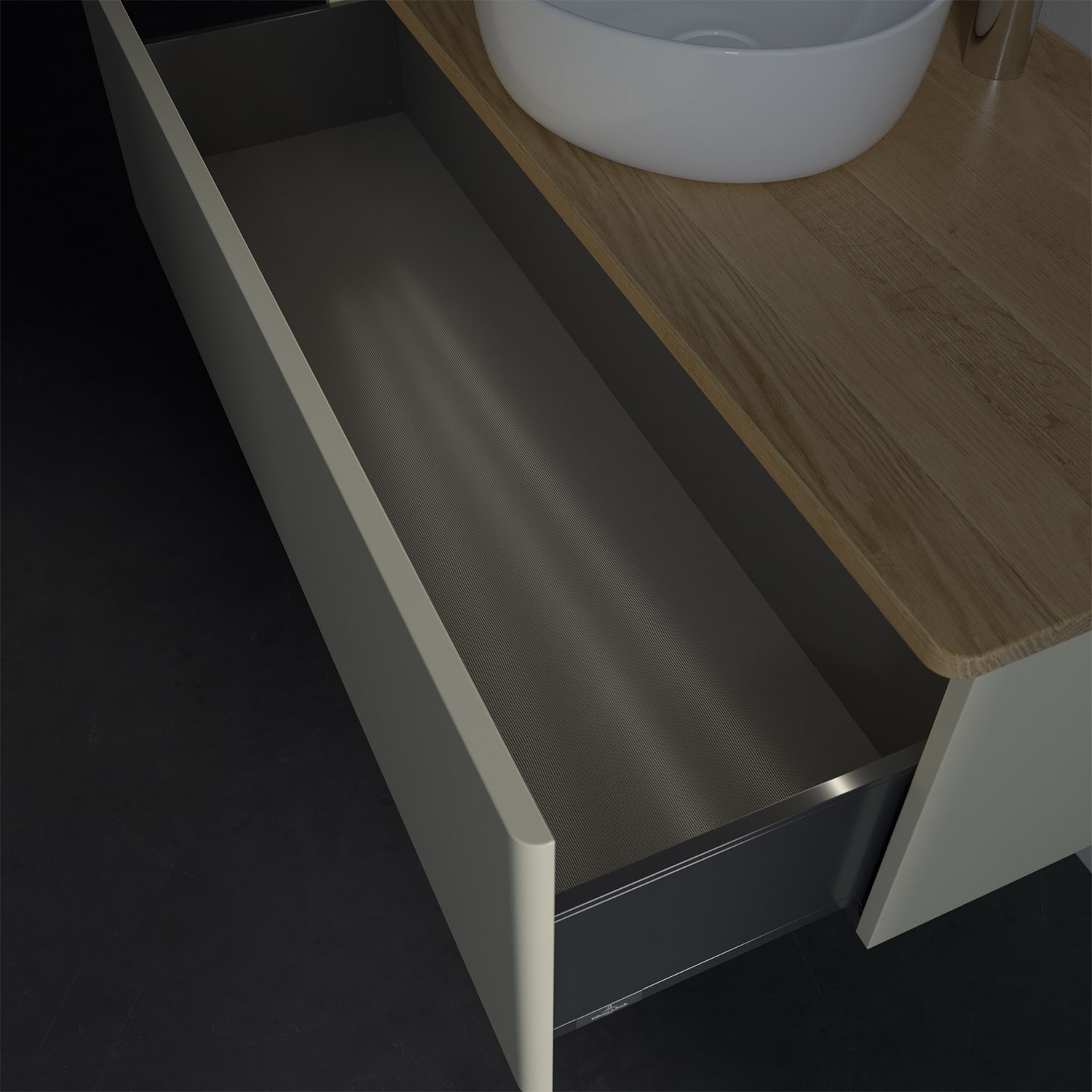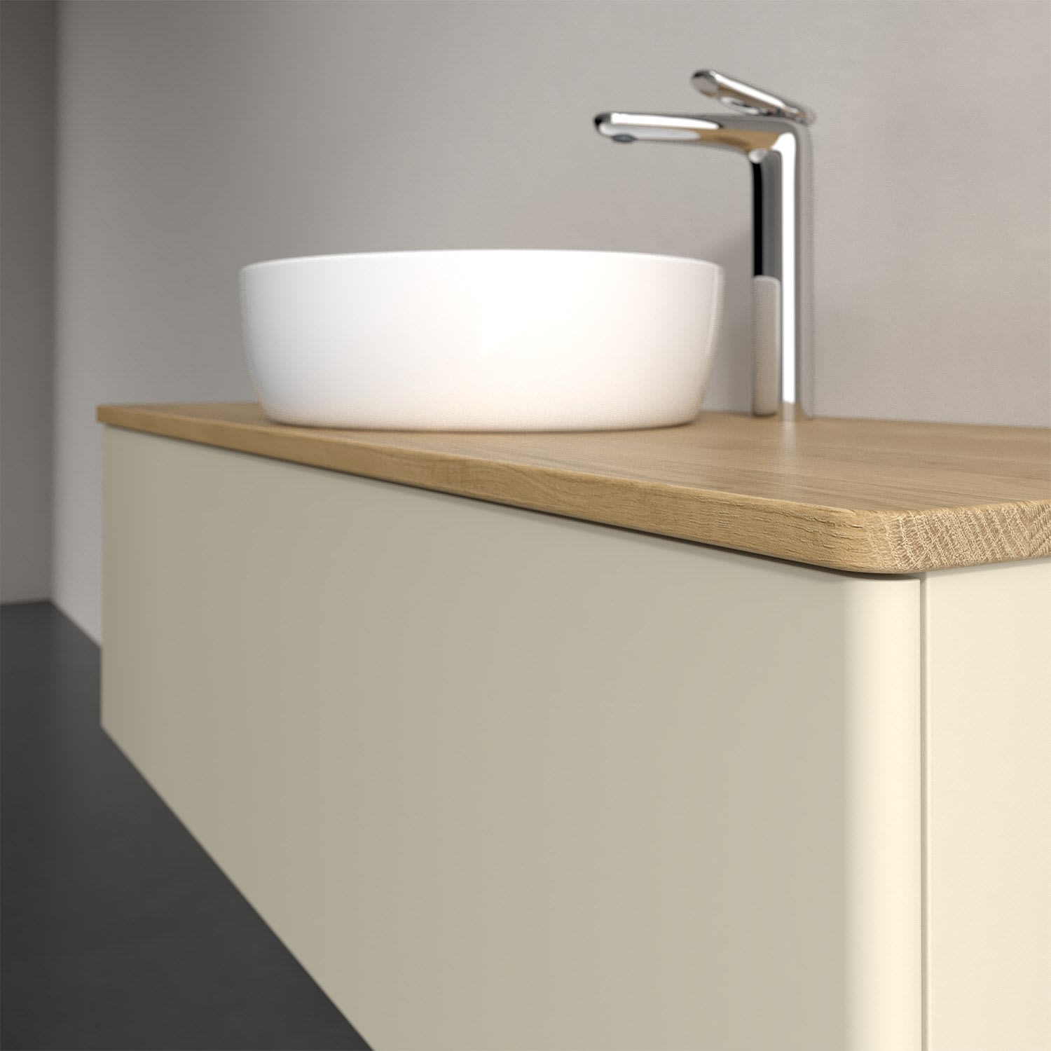 Der wandhängende Antao Waschtischunterschrank von Villeroy & Boch bietet nicht nur jede Menge Stauraum – er ist dank seines naturinspirierten Designs mit seinen abgerundeten Kanten auch noch besonders stilvoll und schafft eine gemütliche Atmosphäre im Badezimmer. Auf der Waschtischplatte bietet sich rechts und links neben dem Waschtisch viel Platz für Zahnbürstenbecher oder Seifenspender. Ein extra hoher Auszug bietet viel Platz, um alles Notwendige zu verstauen und Ordnung zu halten. Öffnen lässt er sich durch leichten Druck auf die grifflose Front. Dabei aktiviert sich übrigens die Auszugsbeleuchtung in angenehmem Warmweiß. Dank Vollauszug hat man immer alles im Blick und der Antirutschboden verhindert ein Umfallen oder Verrutschen der Gegenstände. Einfach clever! Für eine besonders leichte Pflege sorgt die mehrschichtig deckend lackierte Oberfläche. Bei der Ausführung in Massivholz wird dank des verarbeiteten Massivholzes jedes Möbel zu einem Unikat, das sich durch das lebendige Naturmaterial durch seine einzigartige Struktur und Maserung auszeichnet.