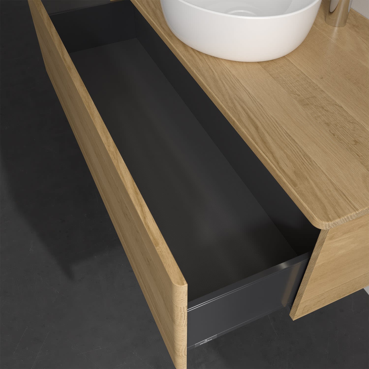 Der wandhängende Antao Waschtischunterschrank von Villeroy & Boch bietet nicht nur jede Menge Stauraum – er ist dank seines naturinspirierten Designs mit seinen abgerundeten Kanten auch noch besonders stilvoll und schafft eine gemütliche Atmosphäre im Badezimmer. Auf der Waschtischplatte bietet sich rechts und links neben dem Waschtisch viel Platz für Zahnbürstenbecher oder Seifenspender. Ein extra hoher Auszug bietet viel Platz, um alles Notwendige zu verstauen und Ordnung zu halten. Öffnen lässt er sich durch leichten Druck auf die grifflose Front. Dabei aktiviert sich übrigens die Auszugsbeleuchtung in angenehmem Warmweiß. Dank Vollauszug hat man immer alles im Blick und der Antirutschboden verhindert ein Umfallen oder Verrutschen der Gegenstände. Einfach clever! Für eine besonders leichte Pflege sorgt die mehrschichtig deckend lackierte Oberfläche. Bei der Ausführung in Massivholz wird dank des verarbeiteten Massivholzes jedes Möbel zu einem Unikat, das sich durch das lebendige Naturmaterial durch seine einzigartige Struktur und Maserung auszeichnet.