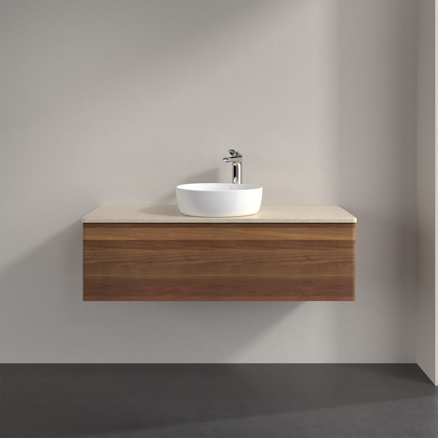 Villeroy & Boch Antao Waschbeckenunterschrank, 120 x 36 cm, 1 Auszug mit LED-Licht, Front ohne Struktur, mit Hahnloch, für Waschtisch mittig