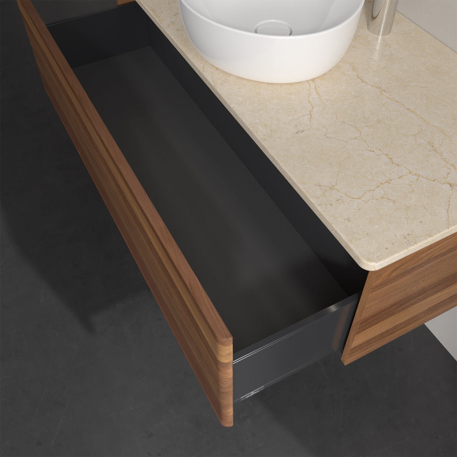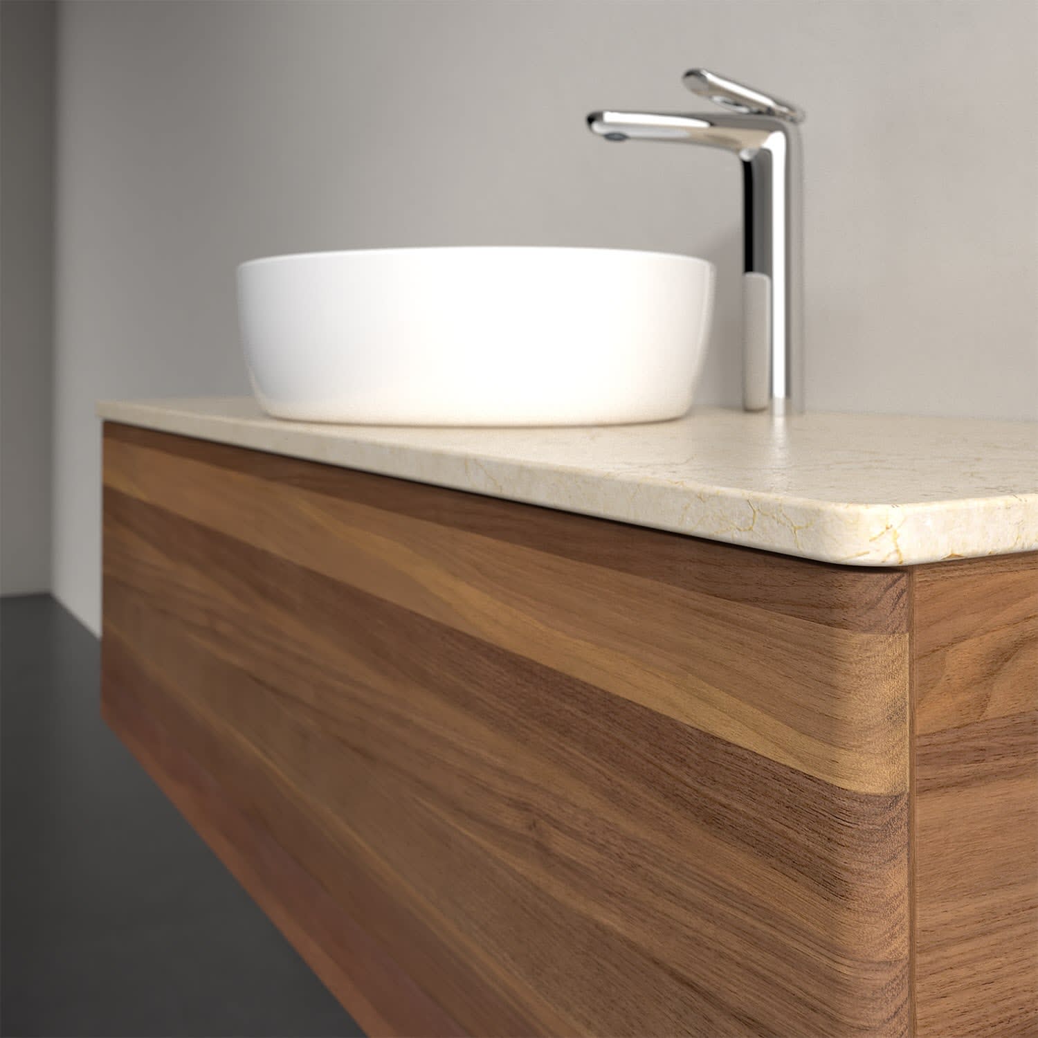 Der wandhängende Antao Waschtischunterschrank von Villeroy & Boch bietet nicht nur jede Menge Stauraum – er ist dank seines naturinspirierten Designs mit seinen abgerundeten Kanten auch noch besonders stilvoll und schafft eine gemütliche Atmosphäre im Badezimmer. Auf der Waschtischplatte bietet sich rechts und links neben dem Waschtisch viel Platz für Zahnbürstenbecher oder Seifenspender. Ein extra hoher Auszug bietet viel Platz, um alles Notwendige zu verstauen und Ordnung zu halten. Öffnen lässt er sich durch leichten Druck auf die grifflose Front. Dabei aktiviert sich übrigens die Auszugsbeleuchtung in angenehmem Warmweiß. Dank Vollauszug hat man immer alles im Blick und der Antirutschboden verhindert ein Umfallen oder Verrutschen der Gegenstände. Einfach clever! Für eine besonders leichte Pflege sorgt die mehrschichtig deckend lackierte Oberfläche. Bei der Ausführung in Massivholz wird dank des verarbeiteten Massivholzes jedes Möbel zu einem Unikat, das sich durch das lebendige Naturmaterial durch seine einzigartige Struktur und Maserung auszeichnet.