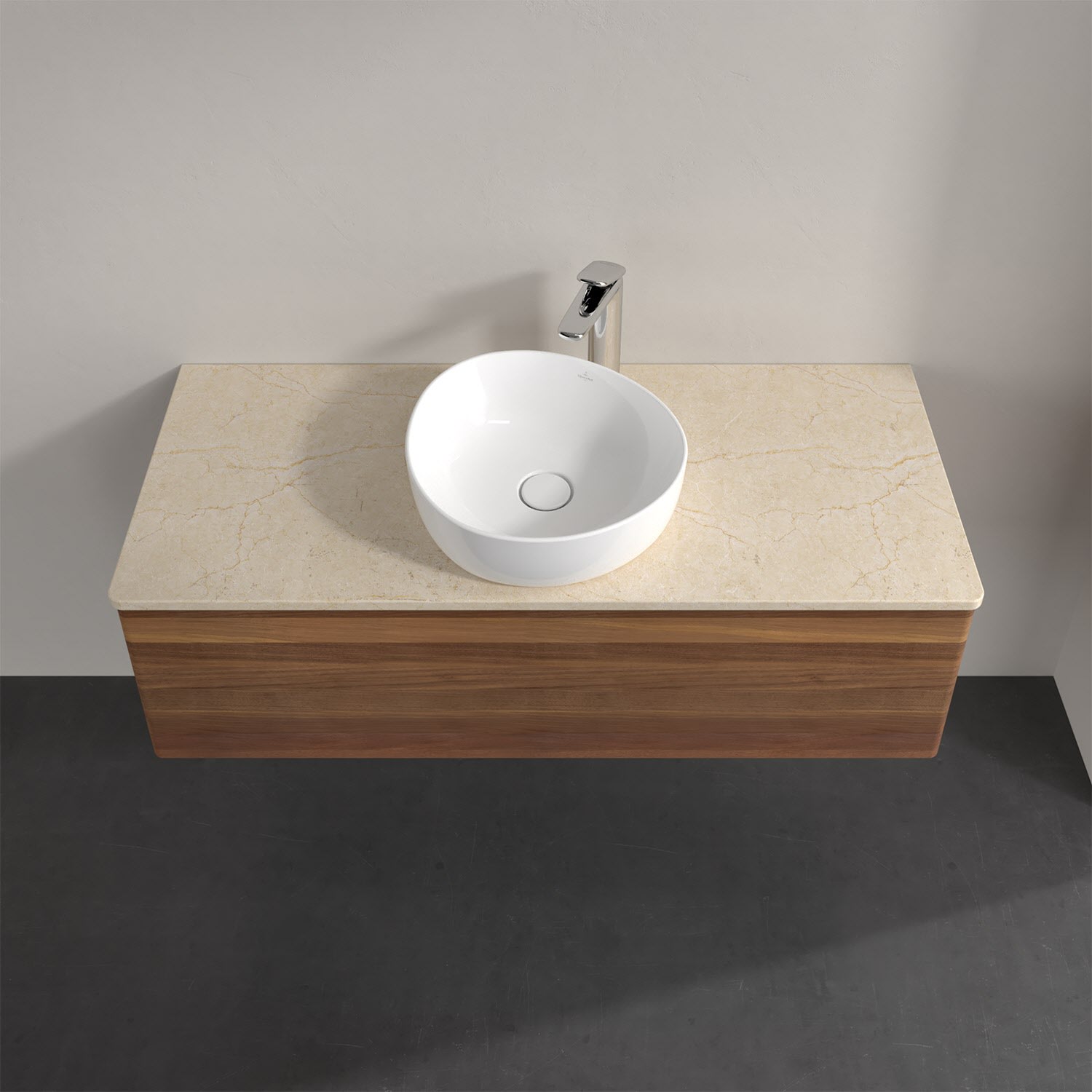 Für diesen Waschbeckenunterschrank stehen Ihnen Aufsatzwaschtische aus verschiedenen Serien zur Verfügung (siehe "Passliste" unter Downloads). Ein ausgewähltes Beispiel finden Sie im Zubehör. Den Waschtisch bitte separat mitbestellen.