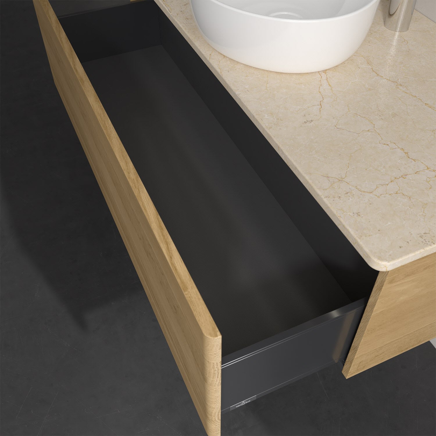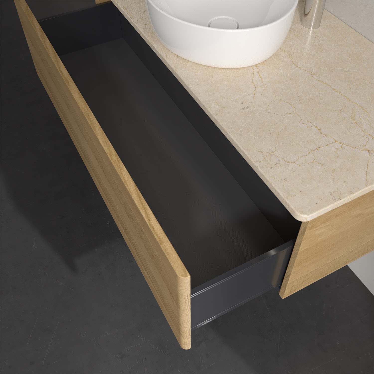 Der wandhängende Antao Waschtischunterschrank von Villeroy & Boch bietet nicht nur jede Menge Stauraum – er ist dank seines naturinspirierten Designs mit seinen abgerundeten Kanten auch noch besonders stilvoll und schafft eine gemütliche Atmosphäre im Badezimmer. Auf der Waschtischplatte bietet sich rechts und links neben dem Waschtisch viel Platz für Zahnbürstenbecher oder Seifenspender. Ein extra hoher Auszug bietet viel Platz, um alles Notwendige zu verstauen und Ordnung zu halten. Öffnen lässt er sich durch leichten Druck auf die grifflose Front. Dabei aktiviert sich übrigens die Auszugsbeleuchtung in angenehmem Warmweiß. Dank Vollauszug hat man immer alles im Blick und der Antirutschboden verhindert ein Umfallen oder Verrutschen der Gegenstände. Einfach clever! Für eine besonders leichte Pflege sorgt die mehrschichtig deckend lackierte Oberfläche. Bei der Ausführung in Massivholz wird dank des verarbeiteten Massivholzes jedes Möbel zu einem Unikat, das sich durch das lebendige Naturmaterial durch seine einzigartige Struktur und Maserung auszeichnet.