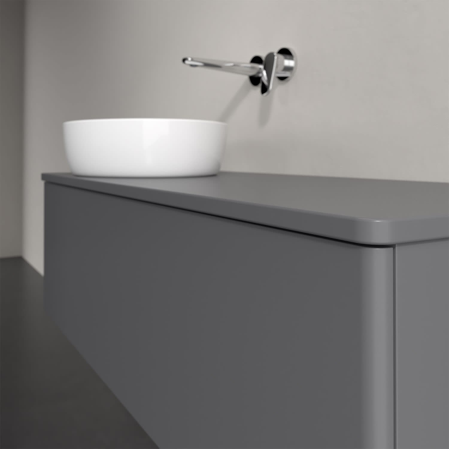 Der wandhängende Antao Waschtischunterschrank von Villeroy & Boch bietet nicht nur jede Menge Stauraum – er ist dank seines naturinspirierten Designs mit seinen abgerundeten Kanten auch noch besonders stilvoll und schafft eine gemütliche Atmosphäre im Badezimmer. Auf der Waschtischplatte bietet sich seitlich des Waschtischs viel Platz für Zahnbürstenbecher oder Seifenspender. Ein extra hoher Auszug bietet viel Platz, um alles Notwendige zu verstauen und Ordnung zu halten. Öffnen lässt er sich durch leichten Druck auf die grifflose Front. Dabei aktiviert sich übrigens die Auszugsbeleuchtung in angenehmem Warmweiß. Dank Vollauszug hat man immer alles im Blick und der Antirutschboden verhindert ein Umfallen oder Verrutschen der Gegenstände. Einfach clever! Für eine besonders leichte Pflege sorgt die mehrschichtig deckend lackierte Oberfläche.