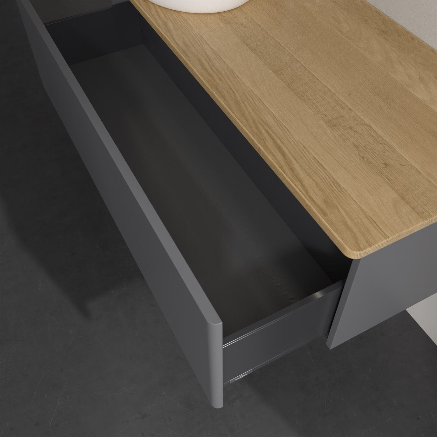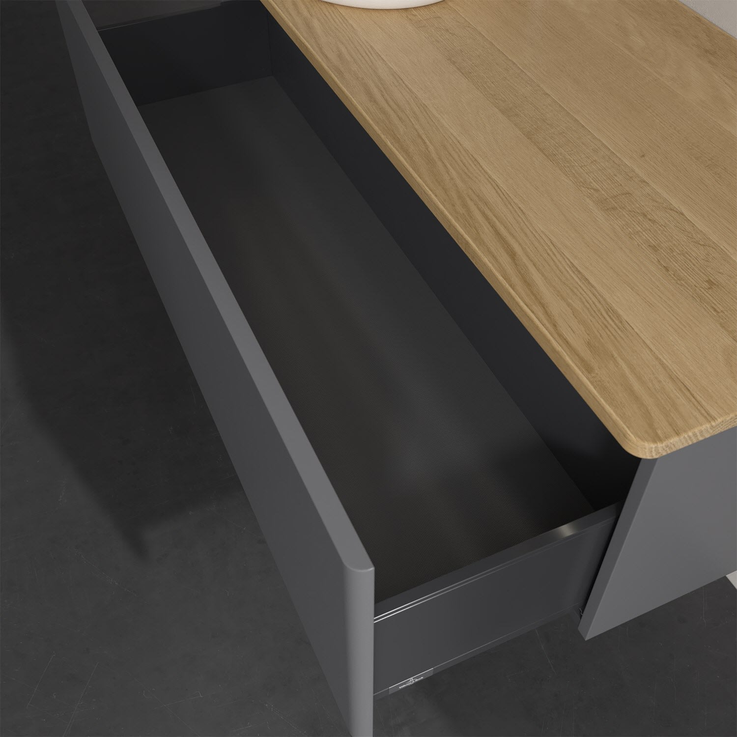 Der wandhängende Antao Waschtischunterschrank von Villeroy & Boch bietet nicht nur jede Menge Stauraum – er ist dank seines naturinspirierten Designs mit seinen abgerundeten Kanten auch noch besonders stilvoll und schafft eine gemütliche Atmosphäre im Badezimmer. Auf der Waschtischplatte bietet sich seitlich des Waschtischs viel Platz für Zahnbürstenbecher oder Seifenspender. Ein extra hoher Auszug bietet viel Platz, um alles Notwendige zu verstauen und Ordnung zu halten. Öffnen lässt er sich durch leichten Druck auf die grifflose Front. Dabei aktiviert sich übrigens die Auszugsbeleuchtung in angenehmem Warmweiß. Dank Vollauszug hat man immer alles im Blick und der Antirutschboden verhindert ein Umfallen oder Verrutschen der Gegenstände. Einfach clever! Für eine besonders leichte Pflege sorgt die mehrschichtig deckend lackierte Oberfläche. Bei der Ausführung in Massivholz wird dank des verarbeiteten Massivholzes jedes Möbel zu einem Unikat, das sich durch das lebendige Naturmaterial durch seine einzigartige Struktur und Maserung auszeichnet.