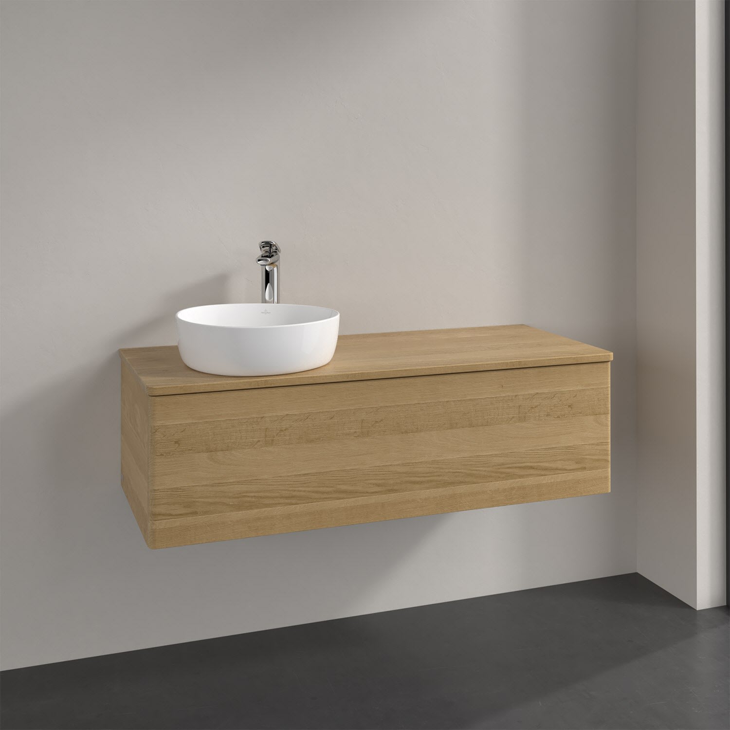 Der wandhängende Antao Waschtischunterschrank von Villeroy & Boch bietet nicht nur jede Menge Stauraum – er ist dank seines naturinspirierten Designs mit seinen abgerundeten Kanten auch noch besonders stilvoll und schafft eine gemütliche Atmosphäre im Badezimmer. Auf der Waschtischplatte bietet sich seitlich des Waschtischs viel Platz für Zahnbürstenbecher oder Seifenspender. Ein extra hoher Auszug bietet viel Platz, um alles Notwendige zu verstauen und Ordnung zu halten. Öffnen lässt er sich durch leichten Druck auf die grifflose Front. Dabei aktiviert sich übrigens die Auszugsbeleuchtung in angenehmem Warmweiß. Dank Vollauszug hat man immer alles im Blick und der Antirutschboden verhindert ein Umfallen oder Verrutschen der Gegenstände. Einfach clever! Für eine besonders leichte Pflege sorgt die mehrschichtig deckend lackierte Oberfläche. Bei der Ausführung in Massivholz wird dank des verarbeiteten Massivholzes jedes Möbel zu einem Unikat, das sich durch das lebendige Naturmaterial durch seine einzigartige Struktur und Maserung auszeichnet.