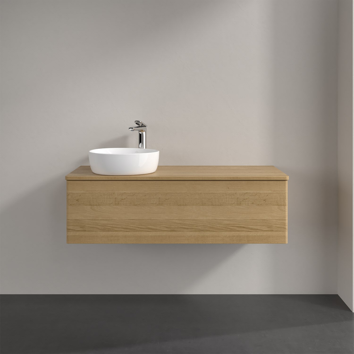 Villeroy & Boch Antao Waschbeckenunterschrank, 120 x 36 cm, 1 Auszug mit LED-Licht, Front ohne Struktur, mit Hahnloch, für Waschtisch links