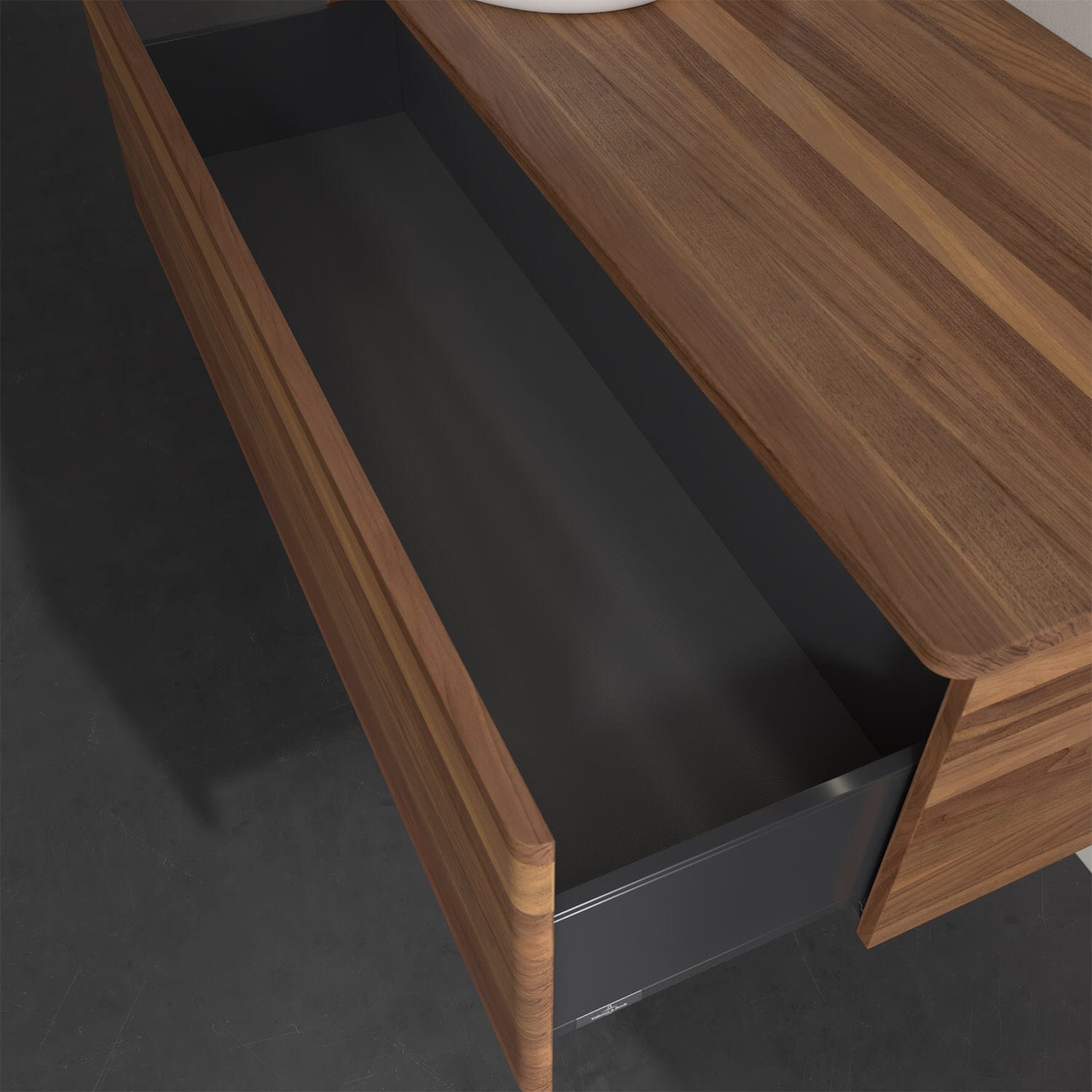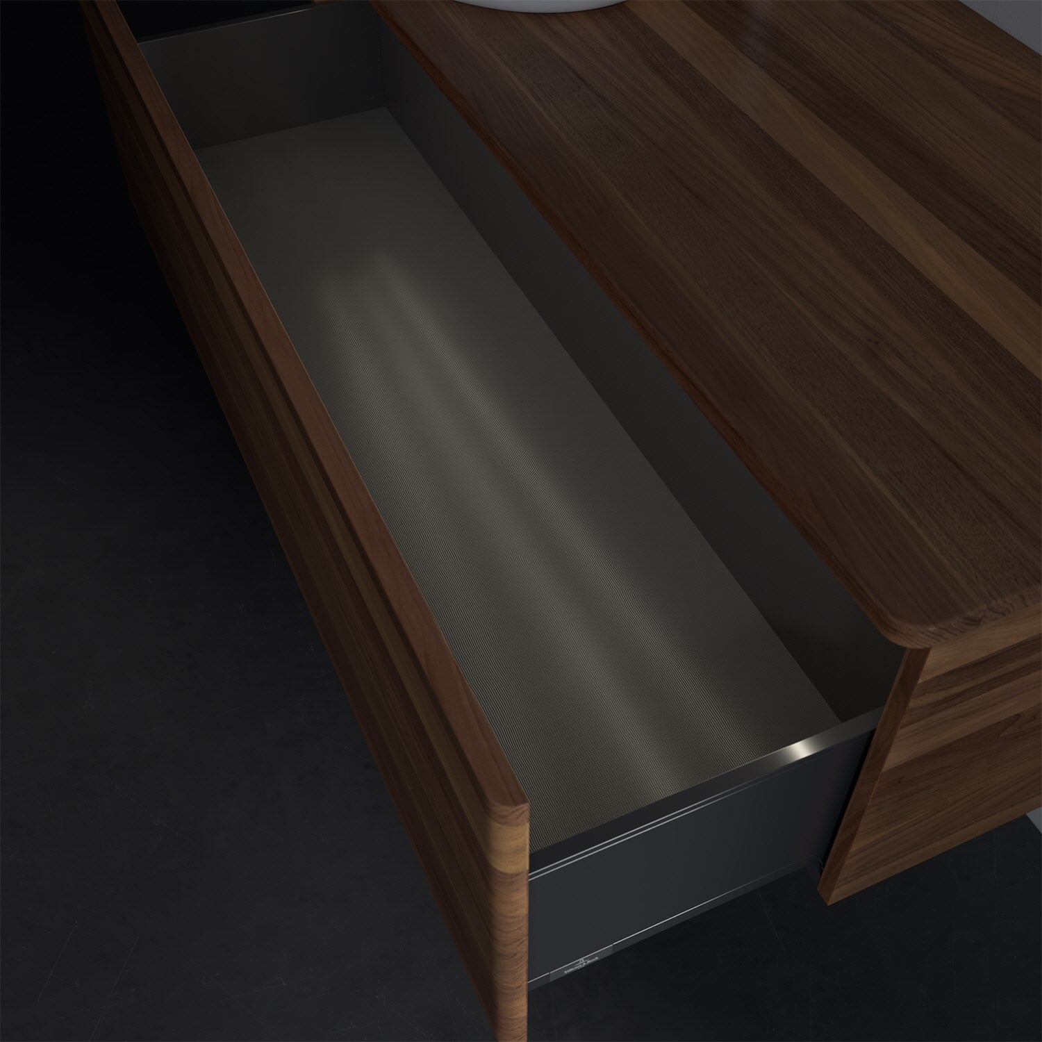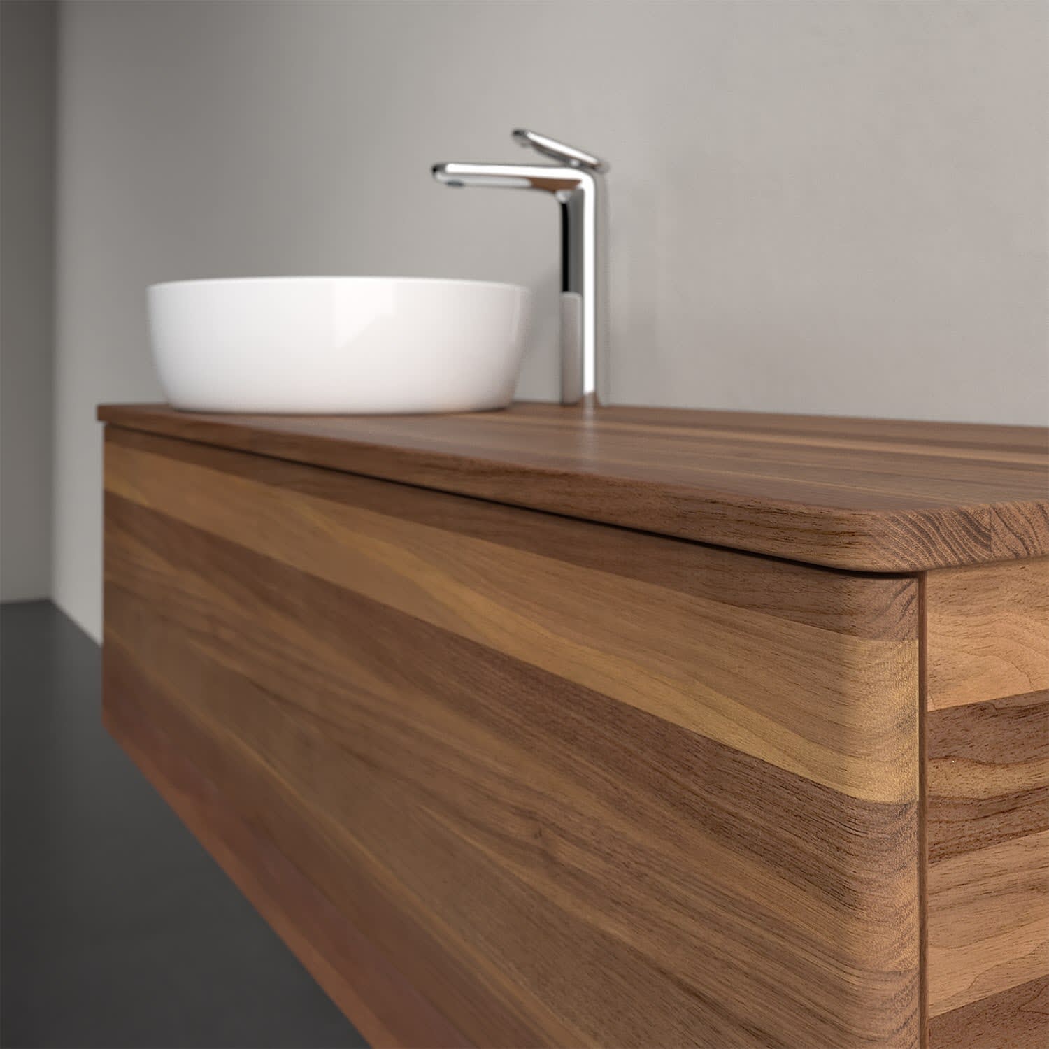 Der wandhängende Antao Waschtischunterschrank von Villeroy & Boch bietet nicht nur jede Menge Stauraum – er ist dank seines naturinspirierten Designs mit seinen abgerundeten Kanten auch noch besonders stilvoll und schafft eine gemütliche Atmosphäre im Badezimmer. Auf der Waschtischplatte bietet sich seitlich des Waschtischs viel Platz für Zahnbürstenbecher oder Seifenspender. Ein extra hoher Auszug bietet viel Platz, um alles Notwendige zu verstauen und Ordnung zu halten. Öffnen lässt er sich durch leichten Druck auf die grifflose Front. Dabei aktiviert sich übrigens die Auszugsbeleuchtung in angenehmem Warmweiß. Dank Vollauszug hat man immer alles im Blick und der Antirutschboden verhindert ein Umfallen oder Verrutschen der Gegenstände. Einfach clever! Für eine besonders leichte Pflege sorgt die mehrschichtig deckend lackierte Oberfläche. Bei der Ausführung in Massivholz wird dank des verarbeiteten Massivholzes jedes Möbel zu einem Unikat, das sich durch das lebendige Naturmaterial durch seine einzigartige Struktur und Maserung auszeichnet.