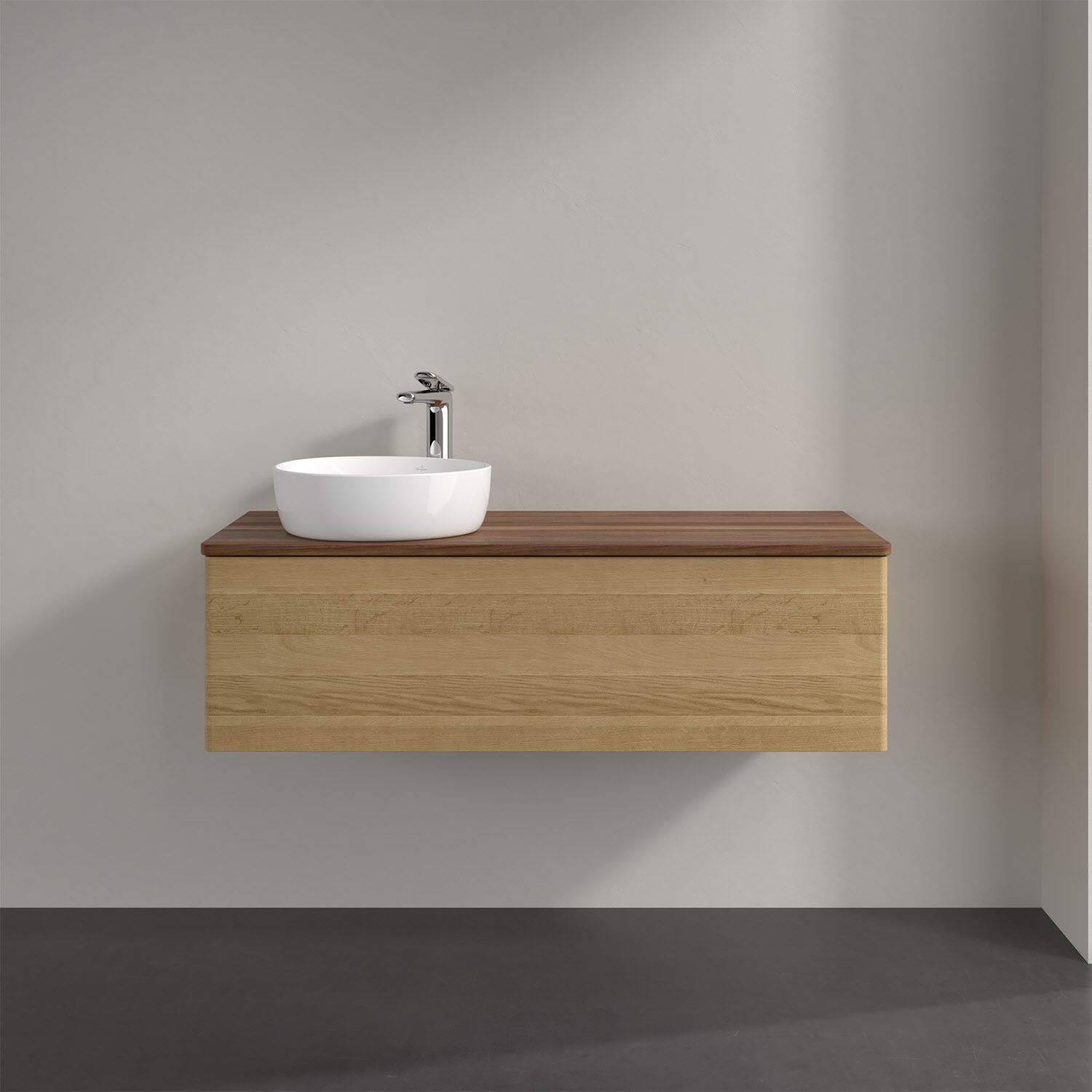 Für diesen Waschbeckenunterschrank stehen Ihnen Aufsatzwaschtische aus verschiedenen Serien zur Verfügung (siehe "Passliste" unter Downloads). Ein ausgewähltes Beispiel finden Sie im Zubehör. Den Waschtisch bitte separat mitbestellen.