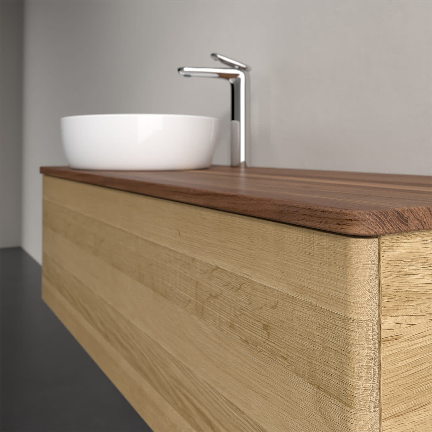 Der wandhängende Antao Waschtischunterschrank von Villeroy & Boch bietet nicht nur jede Menge Stauraum – er ist dank seines naturinspirierten Designs mit seinen abgerundeten Kanten auch noch besonders stilvoll und schafft eine gemütliche Atmosphäre im Badezimmer. Auf der Waschtischplatte bietet sich seitlich des Waschtischs viel Platz für Zahnbürstenbecher oder Seifenspender. Ein extra hoher Auszug bietet viel Platz, um alles Notwendige zu verstauen und Ordnung zu halten. Öffnen lässt er sich durch leichten Druck auf die grifflose Front. Dabei aktiviert sich übrigens die Auszugsbeleuchtung in angenehmem Warmweiß. Dank Vollauszug hat man immer alles im Blick und der Antirutschboden verhindert ein Umfallen oder Verrutschen der Gegenstände. Einfach clever! Für eine besonders leichte Pflege sorgt die mehrschichtig deckend lackierte Oberfläche. Bei der Ausführung in Massivholz wird dank des verarbeiteten Massivholzes jedes Möbel zu einem Unikat, das sich durch das lebendige Naturmaterial durch seine einzigartige Struktur und Maserung auszeichnet.