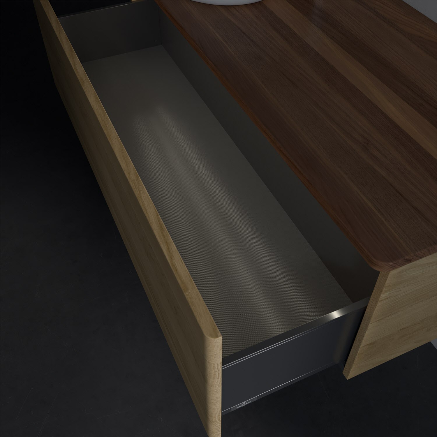 - in Schublade integrierte LED-Leiste mit warmweißem Licht zur Beleuchtung des Innenlebens