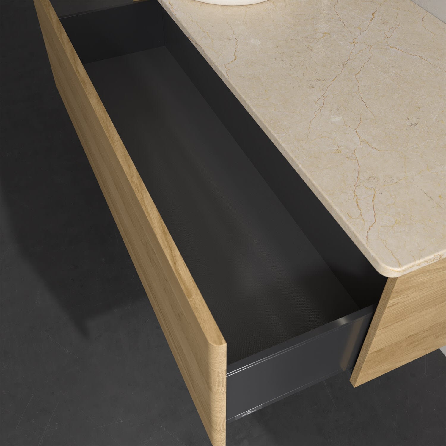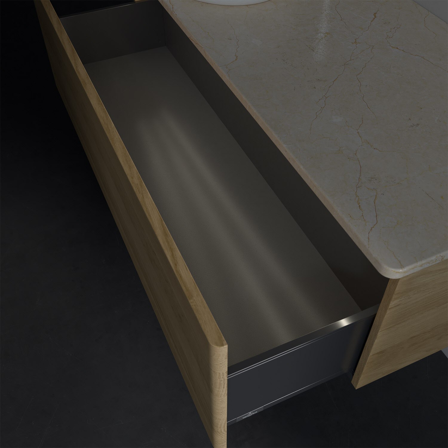 Der wandhängende Antao Waschtischunterschrank von Villeroy & Boch bietet nicht nur jede Menge Stauraum – er ist dank seines naturinspirierten Designs mit seinen abgerundeten Kanten auch noch besonders stilvoll und schafft eine gemütliche Atmosphäre im Badezimmer. Auf der Waschtischplatte bietet sich seitlich des Waschtischs viel Platz für Zahnbürstenbecher oder Seifenspender. Ein extra hoher Auszug bietet viel Platz, um alles Notwendige zu verstauen und Ordnung zu halten. Öffnen lässt er sich durch leichten Druck auf die grifflose Front. Dabei aktiviert sich übrigens die Auszugsbeleuchtung in angenehmem Warmweiß. Dank Vollauszug hat man immer alles im Blick und der Antirutschboden verhindert ein Umfallen oder Verrutschen der Gegenstände. Einfach clever! Für eine besonders leichte Pflege sorgt die mehrschichtig deckend lackierte Oberfläche. Bei der Ausführung in Massivholz wird dank des verarbeiteten Massivholzes jedes Möbel zu einem Unikat, das sich durch das lebendige Naturmaterial durch seine einzigartige Struktur und Maserung auszeichnet.