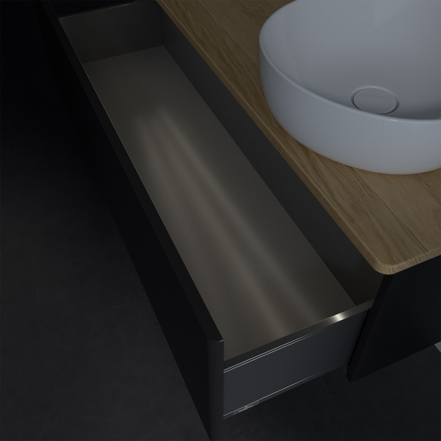 Der wandhängende Antao Waschtischunterschrank von Villeroy & Boch bietet nicht nur jede Menge Stauraum – er ist dank seines naturinspirierten Designs mit seinen abgerundeten Kanten auch noch besonders stilvoll und schafft eine gemütliche Atmosphäre im Badezimmer. Auf der Waschtischplatte bietet sich seitlich des Waschtischs viel Platz für Zahnbürstenbecher oder Seifenspender. Ein extra hoher Auszug bietet viel Platz, um alles Notwendige zu verstauen und Ordnung zu halten. Öffnen lässt er sich durch leichten Druck auf die grifflose Front. Dabei aktiviert sich übrigens die Auszugsbeleuchtung in angenehmem Warmweiß. Dank Vollauszug hat man immer alles im Blick und der Antirutschboden verhindert ein Umfallen oder Verrutschen der Gegenstände. Einfach clever! Für eine besonders leichte Pflege sorgt die mehrschichtig deckend lackierte Oberfläche. Bei der Ausführung in Massivholz wird dank des verarbeiteten Massivholzes jedes Möbel zu einem Unikat, das sich durch das lebendige Naturmaterial durch seine einzigartige Struktur und Maserung auszeichnet.