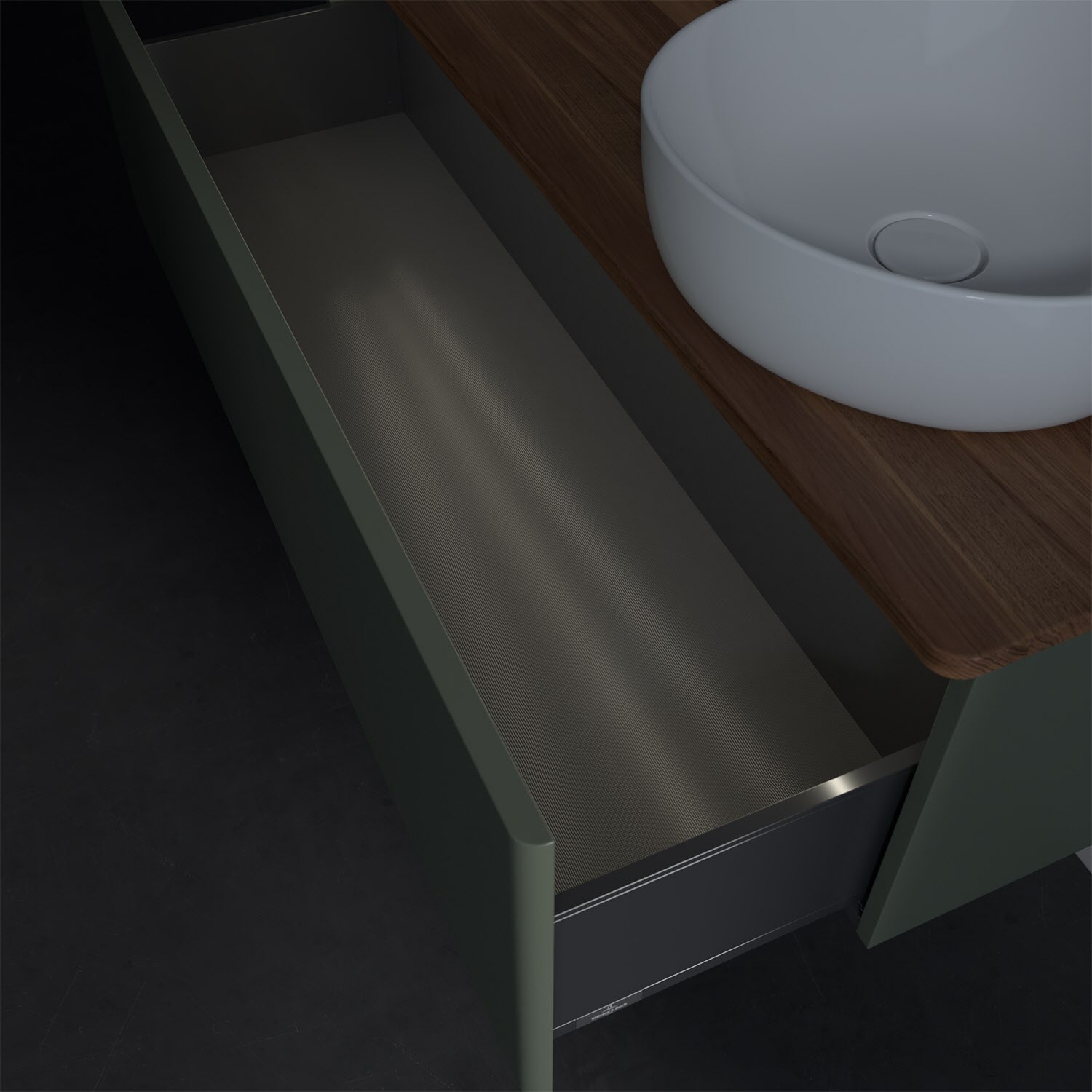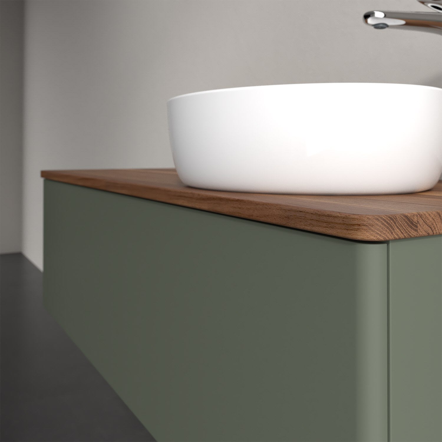 Der wandhängende Antao Waschtischunterschrank von Villeroy & Boch bietet nicht nur jede Menge Stauraum – er ist dank seines naturinspirierten Designs mit seinen abgerundeten Kanten auch noch besonders stilvoll und schafft eine gemütliche Atmosphäre im Badezimmer. Auf der Waschtischplatte bietet sich seitlich des Waschtischs viel Platz für Zahnbürstenbecher oder Seifenspender. Ein extra hoher Auszug bietet viel Platz, um alles Notwendige zu verstauen und Ordnung zu halten. Öffnen lässt er sich durch leichten Druck auf die grifflose Front. Dabei aktiviert sich übrigens die Auszugsbeleuchtung in angenehmem Warmweiß. Dank Vollauszug hat man immer alles im Blick und der Antirutschboden verhindert ein Umfallen oder Verrutschen der Gegenstände. Einfach clever! Für eine besonders leichte Pflege sorgt die mehrschichtig deckend lackierte Oberfläche. Bei der Ausführung in Massivholz wird dank des verarbeiteten Massivholzes jedes Möbel zu einem Unikat, das sich durch das lebendige Naturmaterial durch seine einzigartige Struktur und Maserung auszeichnet.