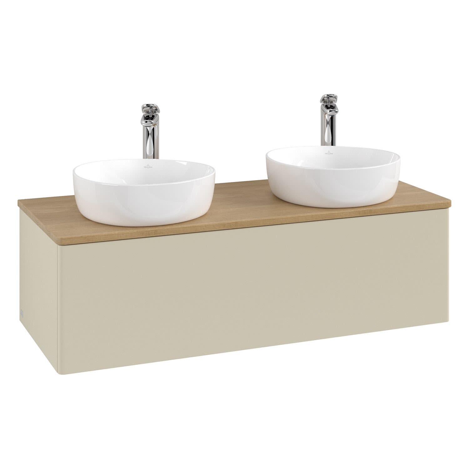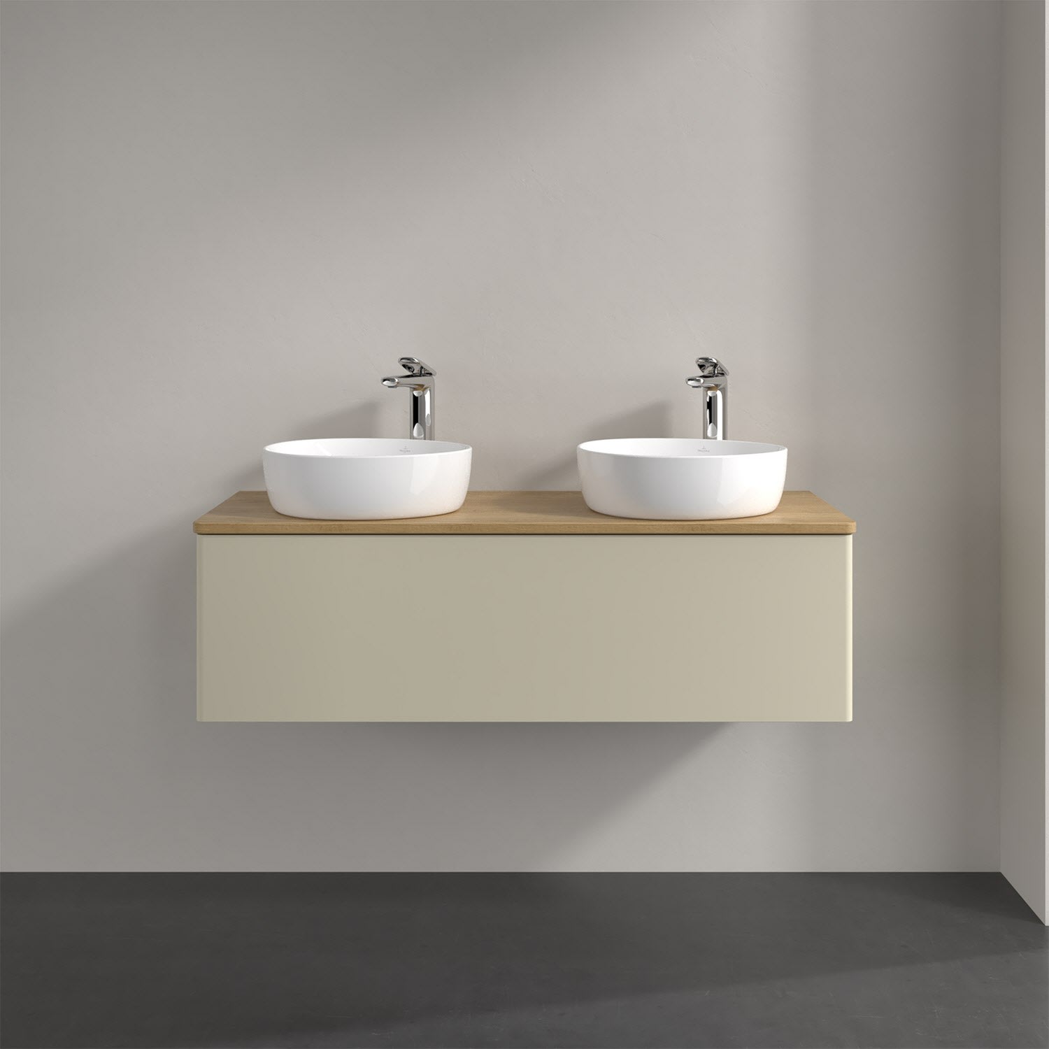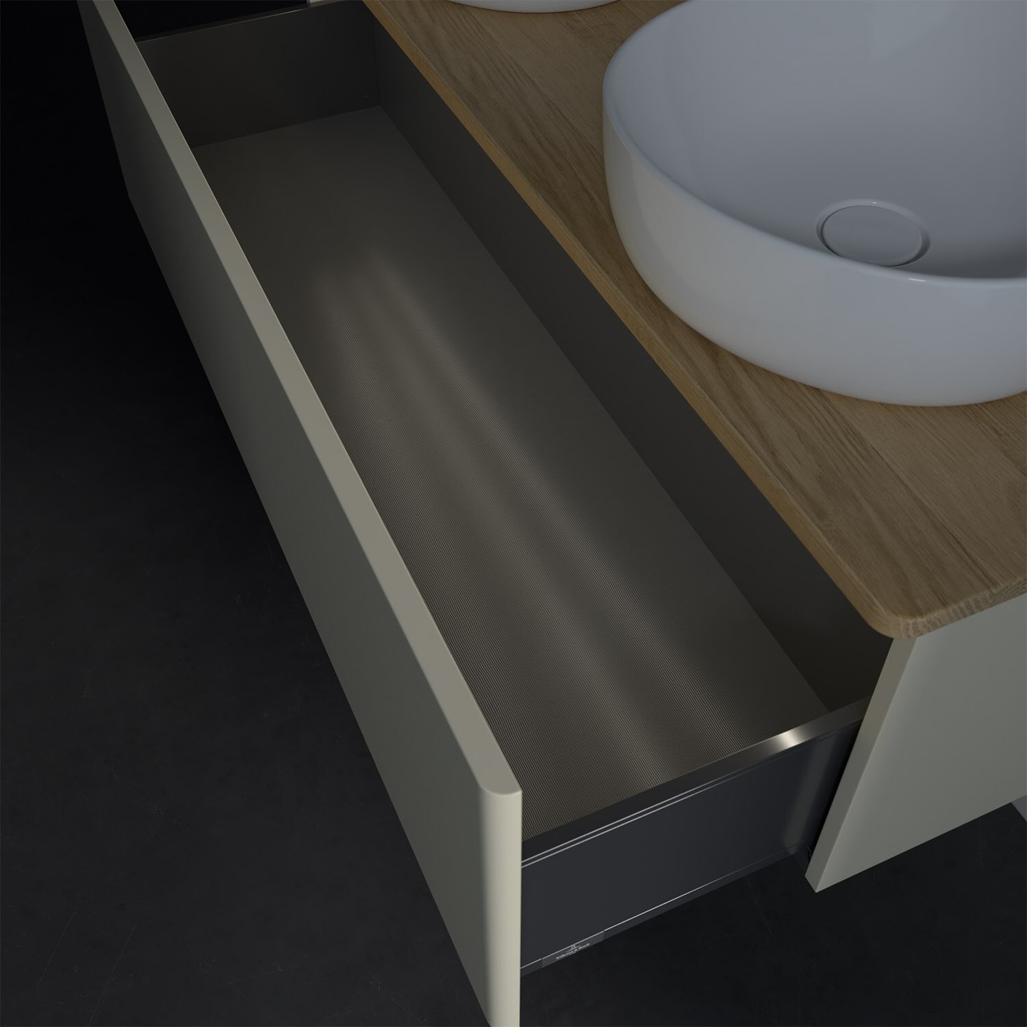 Der wandhängende Antao Waschtischunterschrank von Villeroy & Boch bietet nicht nur jede Menge Stauraum – er ist dank seines naturinspirierten Designs mit seinen abgerundeten Kanten auch noch besonders stilvoll und schafft eine gemütliche Atmosphäre im Badezimmer. Kombiniert mit zwei passenden Aufsatzwaschtischen also die ideale Wahl. Ein extra hoher Auszug bietet viel Platz, um alles Notwendige zu verstauen und Ordnung zu halten. Öffnen lässt er sich durch leichten Druck auf die grifflose Front. Dabei aktiviert sich übrigens die Auszugsbeleuchtung in angenehmem Warmweiß. Dank Vollauszug hat man immer alles im Blick und der Antirutschboden verhindert ein Umfallen oder Verrutschen der Gegenstände. Einfach clever! Für eine besonders leichte Pflege sorgt die mehrschichtig deckend lackierte Oberfläche. Bei der Ausführung in Massivholz wird dank des verarbeiteten Massivholzes jedes Möbel zu einem Unikat, das sich durch das lebendige Naturmaterial durch seine einzigartige Struktur und Maserung auszeichnet.
