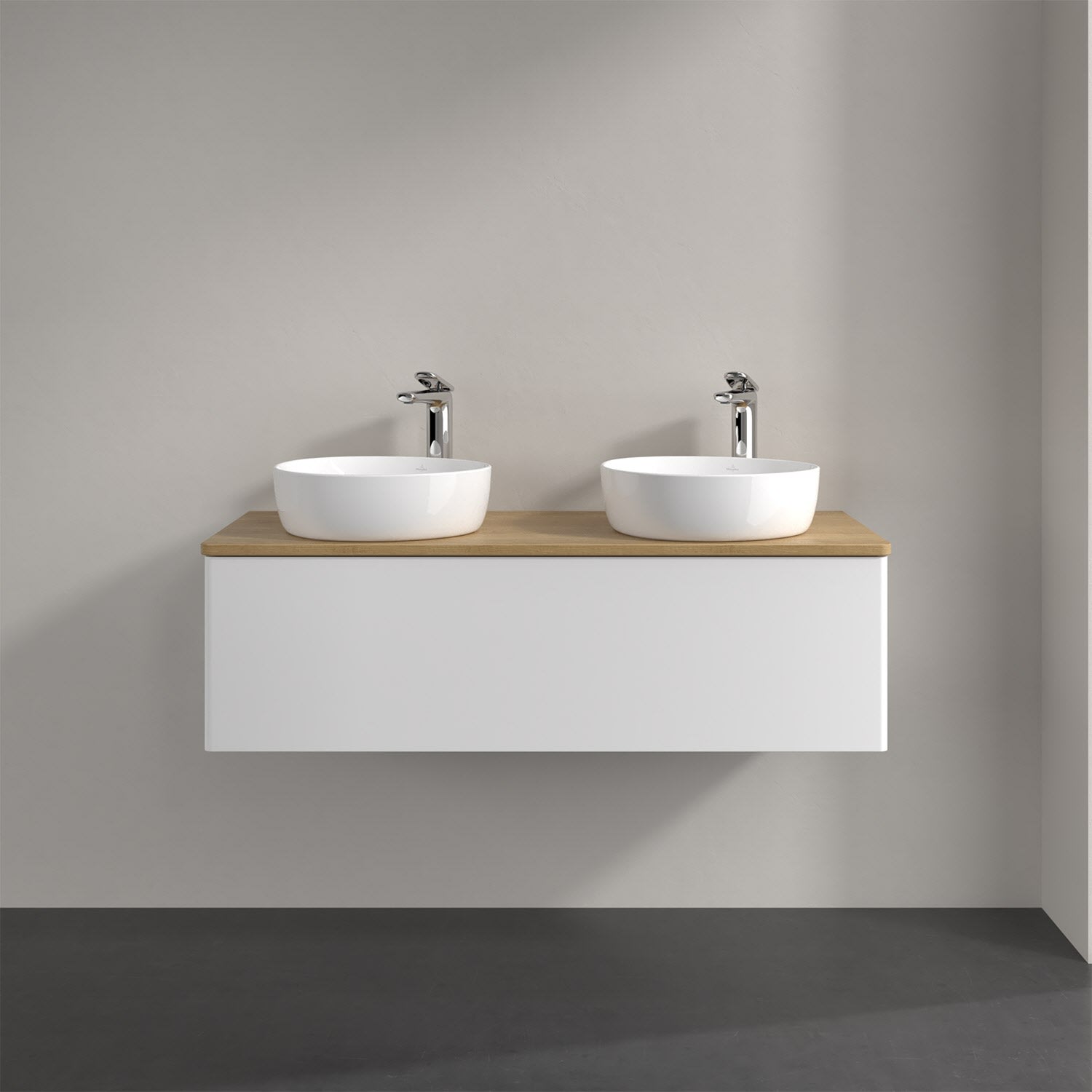 Der wandhängende Antao Waschtischunterschrank von Villeroy & Boch bietet nicht nur jede Menge Stauraum – er ist dank seines naturinspirierten Designs mit seinen abgerundeten Kanten auch noch besonders stilvoll und schafft eine gemütliche Atmosphäre im Badezimmer. Kombiniert mit zwei passenden Aufsatzwaschtischen also die ideale Wahl. Ein extra hoher Auszug bietet viel Platz, um alles Notwendige zu verstauen und Ordnung zu halten. Öffnen lässt er sich durch leichten Druck auf die grifflose Front. Dabei aktiviert sich übrigens die Auszugsbeleuchtung in angenehmem Warmweiß. Dank Vollauszug hat man immer alles im Blick und der Antirutschboden verhindert ein Umfallen oder Verrutschen der Gegenstände. Einfach clever! Für eine besonders leichte Pflege sorgt die mehrschichtig deckend lackierte Oberfläche. Bei der Ausführung in Massivholz wird dank des verarbeiteten Massivholzes jedes Möbel zu einem Unikat, das sich durch das lebendige Naturmaterial durch seine einzigartige Struktur und Maserung auszeichnet.