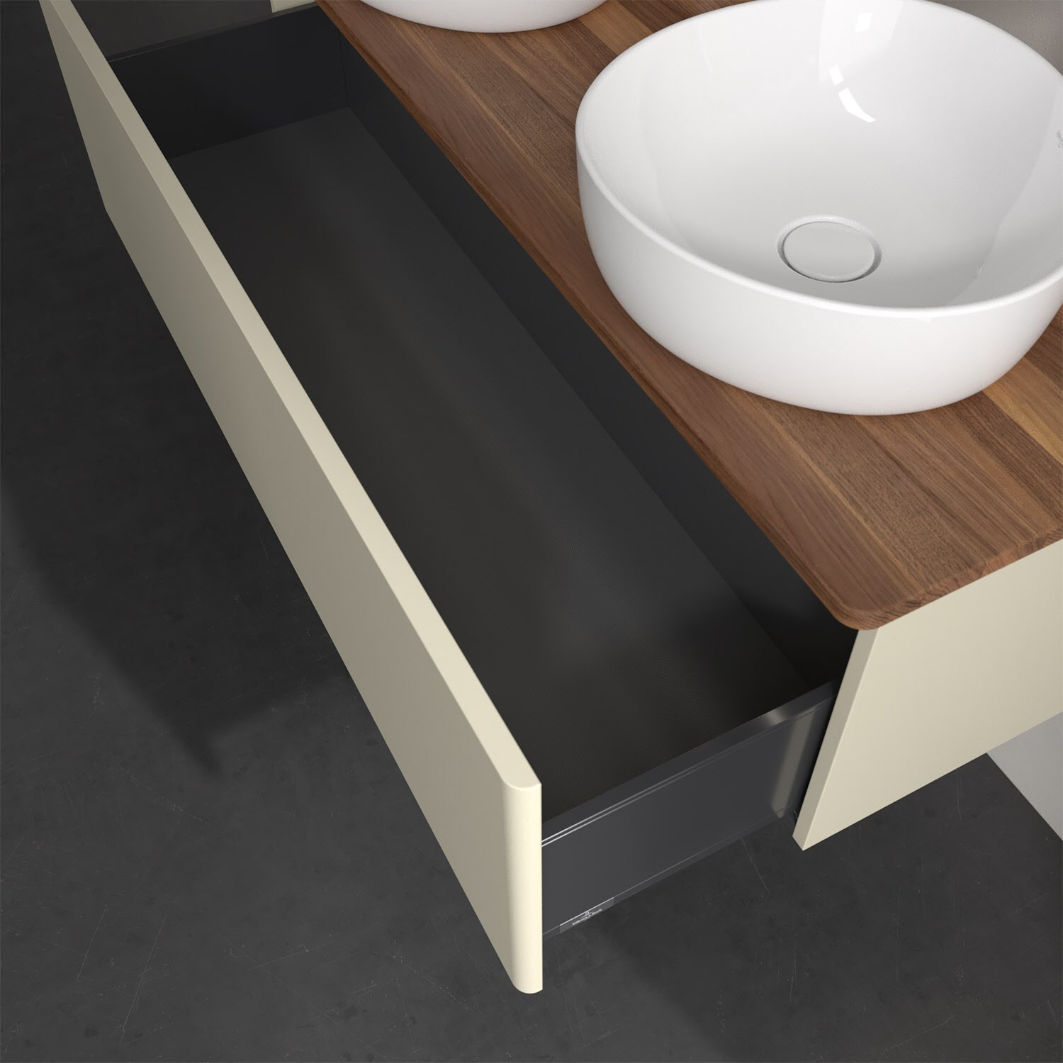 Der wandhängende Antao Waschtischunterschrank von Villeroy & Boch bietet nicht nur jede Menge Stauraum – er ist dank seines naturinspirierten Designs mit seinen abgerundeten Kanten auch noch besonders stilvoll und schafft eine gemütliche Atmosphäre im Badezimmer. Kombiniert mit zwei passenden Aufsatzwaschtischen also die ideale Wahl. Ein extra hoher Auszug bietet viel Platz, um alles Notwendige zu verstauen und Ordnung zu halten. Öffnen lässt er sich durch leichten Druck auf die grifflose Front. Dabei aktiviert sich übrigens die Auszugsbeleuchtung in angenehmem Warmweiß. Dank Vollauszug hat man immer alles im Blick und der Antirutschboden verhindert ein Umfallen oder Verrutschen der Gegenstände. Einfach clever! Für eine besonders leichte Pflege sorgt die mehrschichtig deckend lackierte Oberfläche.Bei der Ausführung in Massivholz wird dank des verarbeiteten Massivholzes jedes Möbel zu einem Unikat, das sich durch das lebendige Naturmaterial durch seine einzigartige Struktur und Maserung auszeichnet.