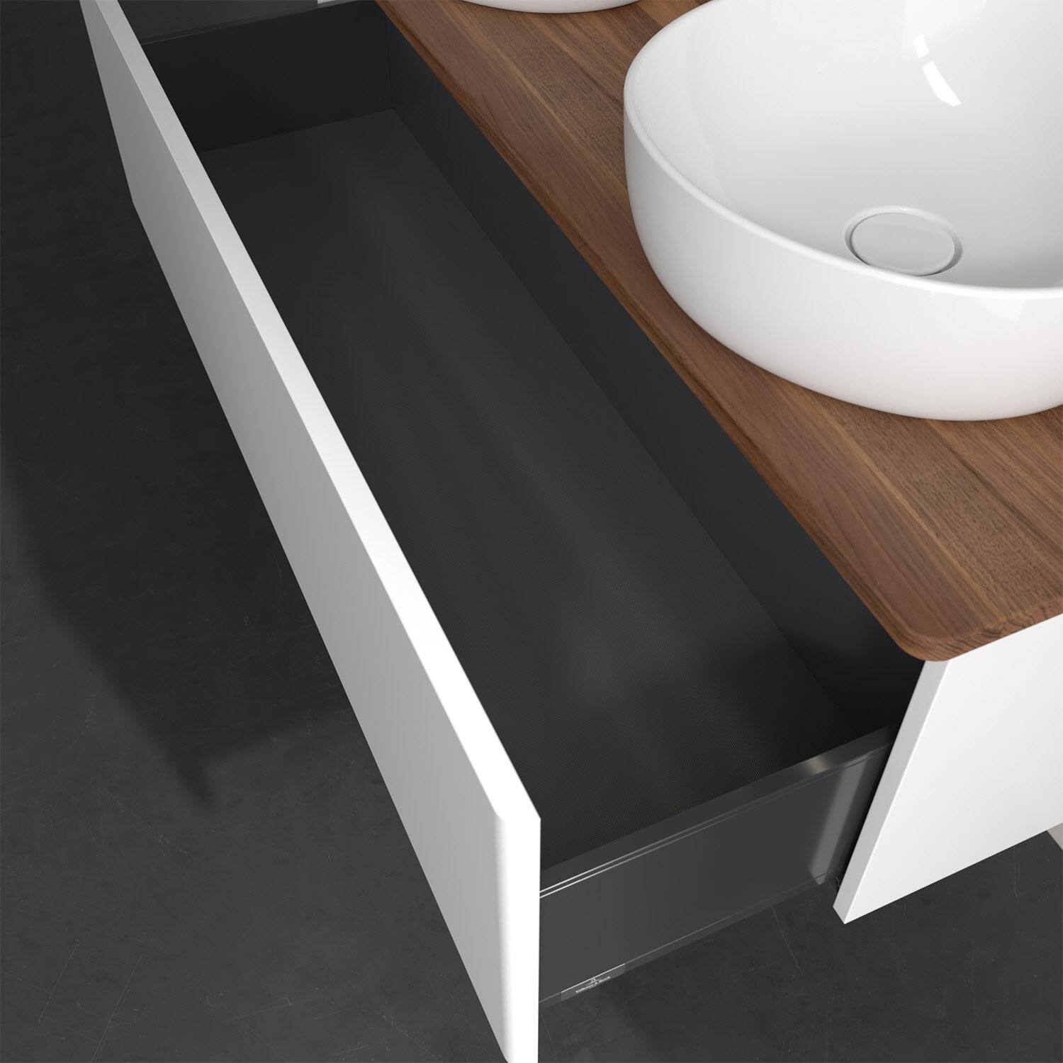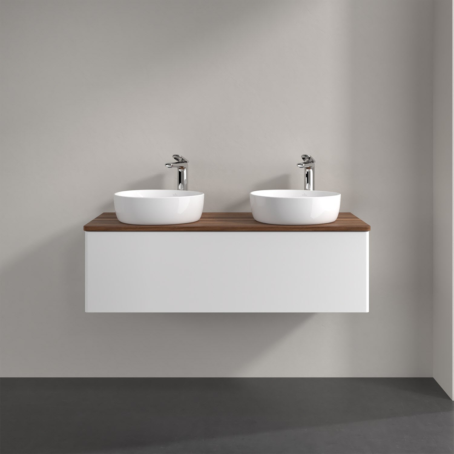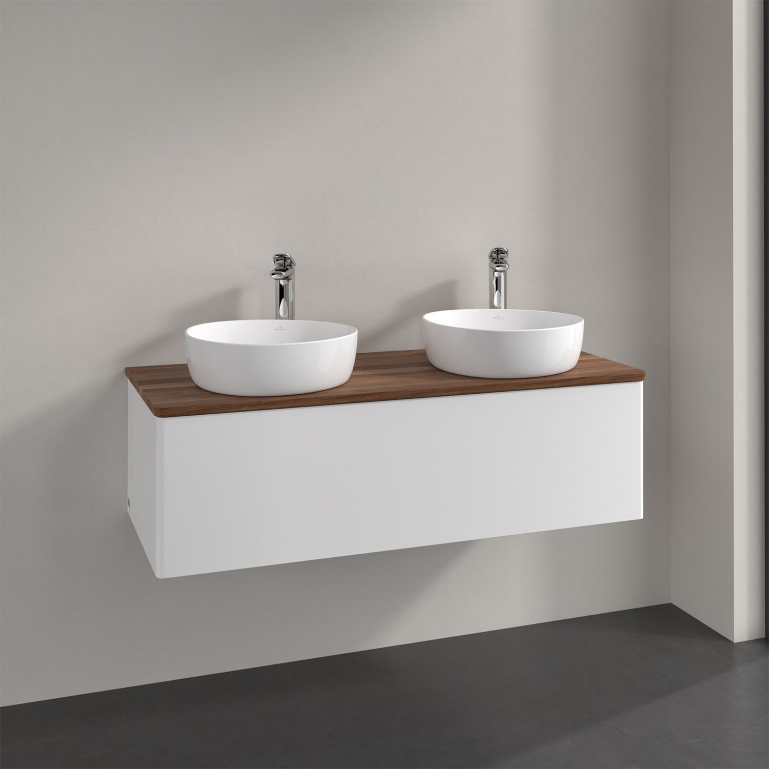 Der wandhängende Antao Waschtischunterschrank von Villeroy & Boch bietet nicht nur jede Menge Stauraum – er ist dank seines naturinspirierten Designs mit seinen abgerundeten Kanten auch noch besonders stilvoll und schafft eine gemütliche Atmosphäre im Badezimmer. Kombiniert mit zwei passenden Aufsatzwaschtischen also die ideale Wahl. Ein extra hoher Auszug bietet viel Platz, um alles Notwendige zu verstauen und Ordnung zu halten. Öffnen lässt er sich durch leichten Druck auf die grifflose Front. Dabei aktiviert sich übrigens die Auszugsbeleuchtung in angenehmem Warmweiß. Dank Vollauszug hat man immer alles im Blick und der Antirutschboden verhindert ein Umfallen oder Verrutschen der Gegenstände. Einfach clever! Für eine besonders leichte Pflege sorgt die mehrschichtig deckend lackierte Oberfläche.Bei der Ausführung in Massivholz wird dank des verarbeiteten Massivholzes jedes Möbel zu einem Unikat, das sich durch das lebendige Naturmaterial durch seine einzigartige Struktur und Maserung auszeichnet.