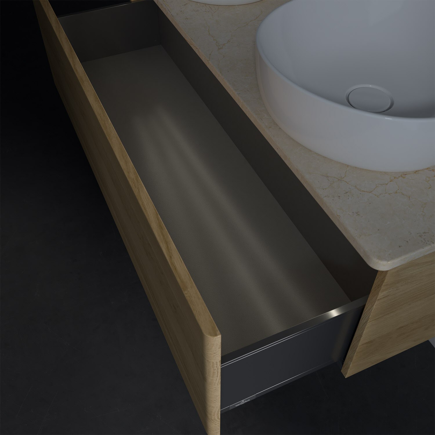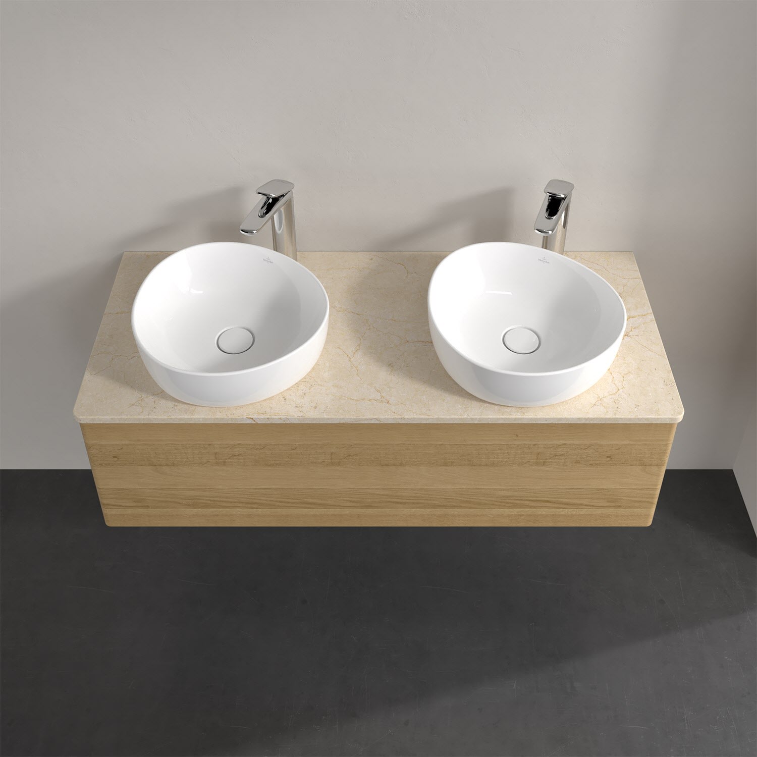 Der wandhängende Antao Waschtischunterschrank von Villeroy & Boch bietet nicht nur jede Menge Stauraum – er ist dank seines naturinspirierten Designs mit seinen abgerundeten Kanten auch noch besonders stilvoll und schafft eine gemütliche Atmosphäre im Badezimmer. Kombiniert mit zwei passenden Aufsatzwaschtischen also die ideale Wahl. Ein extra hoher Auszug bietet viel Platz, um alles Notwendige zu verstauen und Ordnung zu halten. Öffnen lässt er sich durch leichten Druck auf die grifflose Front. Dabei aktiviert sich übrigens die Auszugsbeleuchtung in angenehmem Warmweiß. Dank Vollauszug hat man immer alles im Blick und der Antirutschboden verhindert ein Umfallen oder Verrutschen der Gegenstände. Einfach clever! Für eine besonders leichte Pflege sorgt die mehrschichtig deckend lackierte Oberfläche. Bei der Ausführung in Massivholz wird dank des verarbeiteten Massivholzes jedes Möbel zu einem Unikat, das sich durch das lebendige Naturmaterial durch seine einzigartige Struktur und Maserung auszeichnet.