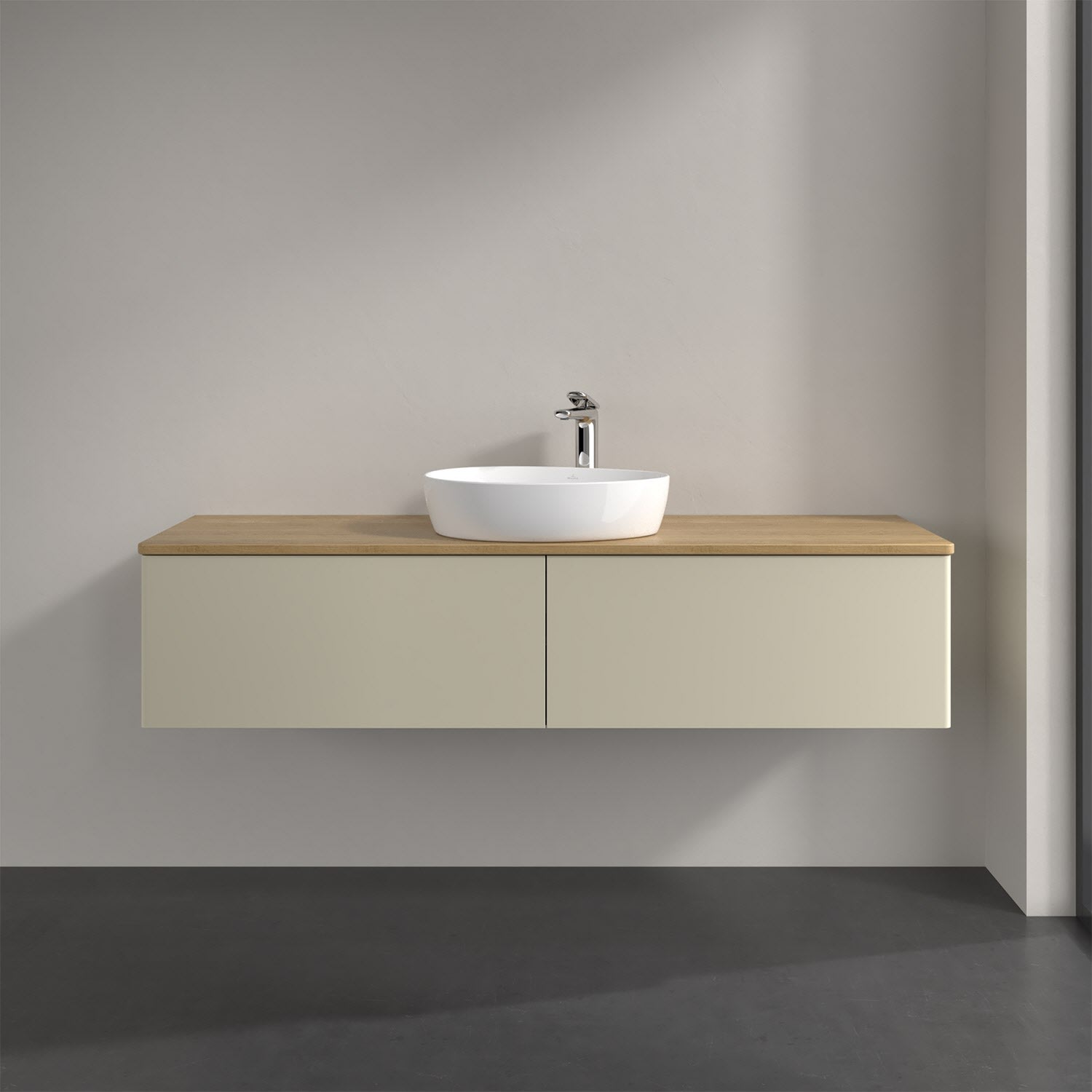 Der wandhängende Antao Waschtischunterschrank bietet mit seinen beiden extra hohen Auszügen und seiner erstaunlichen Größe viel Platz zum Verstauen von Utensilien im Badezimmer. Dank des mittig platzierten Aufsatzwaschtischs gibt es seitlich weiteren Platz für Handtücher, Seifenspender & Co. auf der Waschtischplatte. Inspiriert von der Natur überzeugt der Unterschrank auch optisch mit sanfter Formsprache und abgerundete Kanten. Die grifflosen Auszüge sind mit der Push-to-Open Funktion ausgestattet und verfügen über einen Antirutschboden, damit Utensilien sicher verstaut werden können. Den Überblick behält man dank der warmweißen Auszugsbeleuchtung, die sich automatisch beim Öffnen einschaltet. Mit seiner Vollauszug- und Selbsteinzug-Funktion ist der Schrank praktisch und leicht zu bedienen. Qualität von Villeroy & Boch! Für eine besonders leichte Pflege sorgt die mehrschichtig deckend lackierte Oberfläche. Bei der Ausführung in Massivholz wird dank des verarbeiteten Massivholzes jedes Möbel zu einem Unikat, das sich durch das lebendige Naturmaterial durch seine einzigartige Struktur und Maserung auszeichnet.