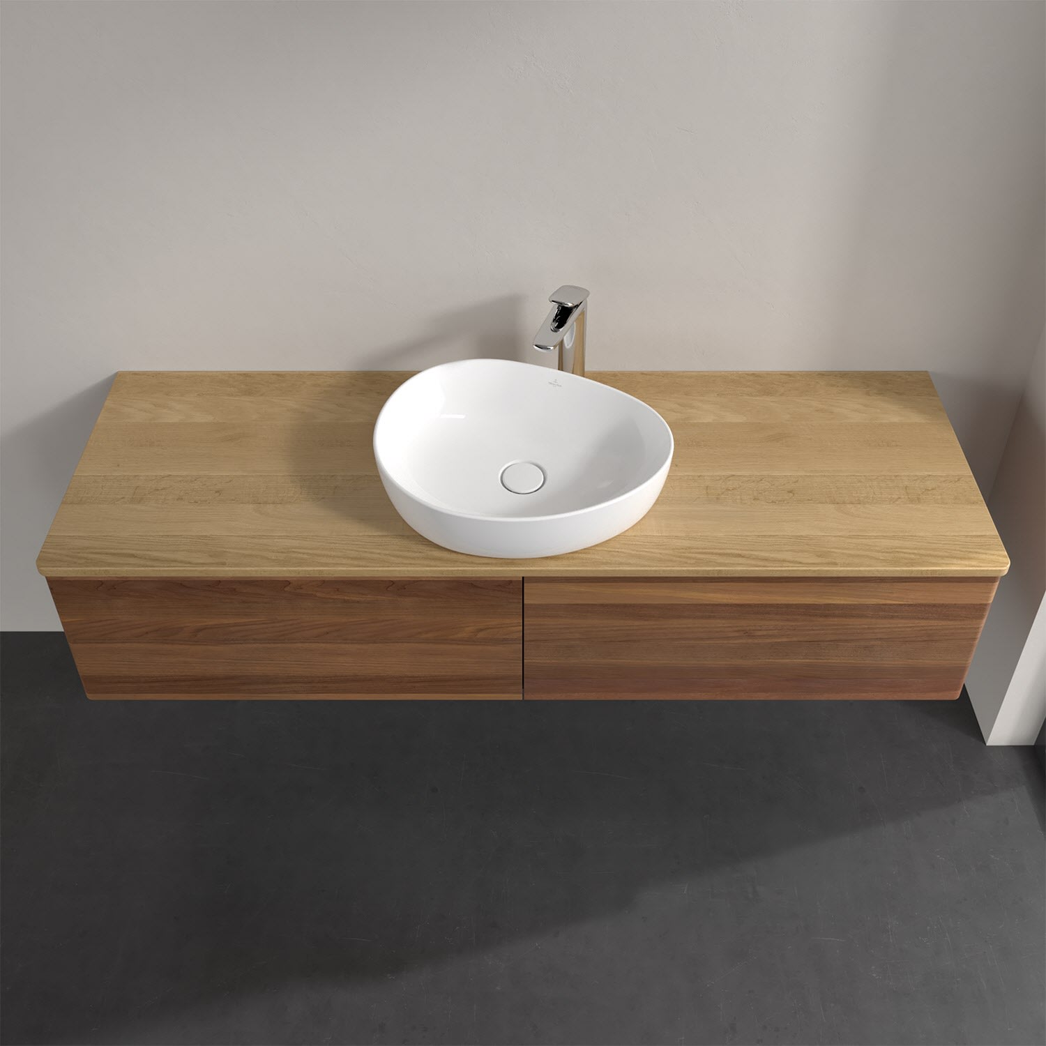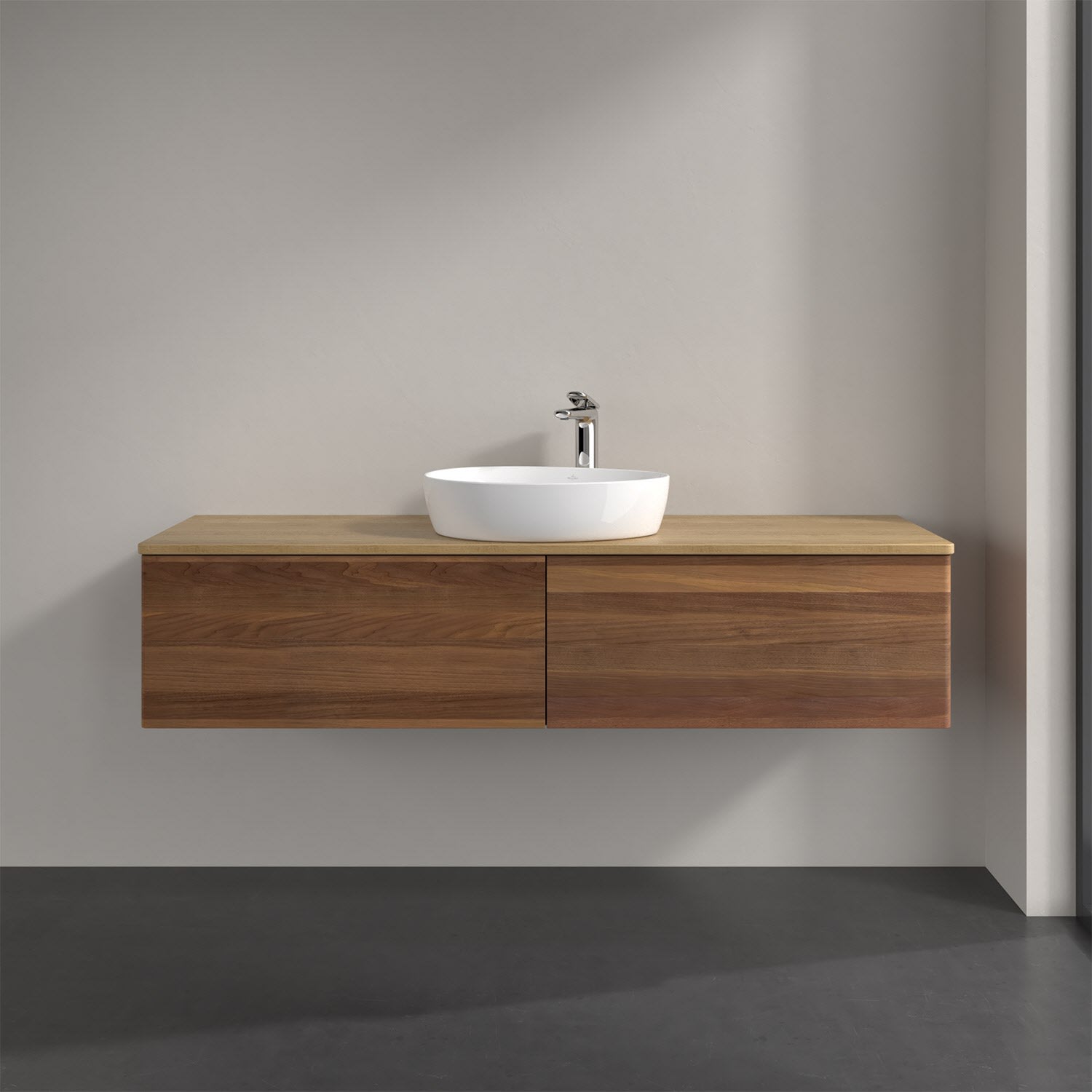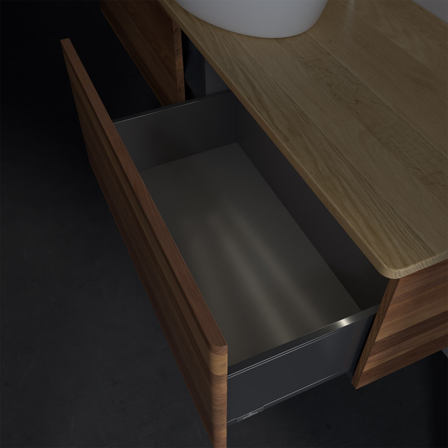 Der wandhängende Antao Waschtischunterschrank bietet mit seinen beiden extra hohen Auszügen und seiner erstaunlichen Größe viel Platz zum Verstauen von Utensilien im Badezimmer. Dank des mittig platzierten Aufsatzwaschtischs gibt es seitlich weiteren Platz für Handtücher, Seifenspender & Co. auf der Waschtischplatte. Inspiriert von der Natur überzeugt der Unterschrank auch optisch mit sanfter Formsprache und abgerundete Kanten. Die grifflosen Auszüge sind mit der Push-to-Open Funktion ausgestattet und verfügen über einen Antirutschboden, damit Utensilien sicher verstaut werden können. Den Überblick behält man dank der warmweißen Auszugsbeleuchtung, die sich automatisch beim Öffnen einschaltet. Mit seiner Vollauszug- und Selbsteinzug-Funktion ist der Schrank praktisch und leicht zu bedienen. Qualität von Villeroy & Boch! Für eine besonders leichte Pflege sorgt die mehrschichtig deckend lackierte Oberfläche. Bei der Ausführung in Massivholz wird dank des verarbeiteten Massivholzes jedes Möbel zu einem Unikat, das sich durch das lebendige Naturmaterial durch seine einzigartige Struktur und Maserung auszeichnet.