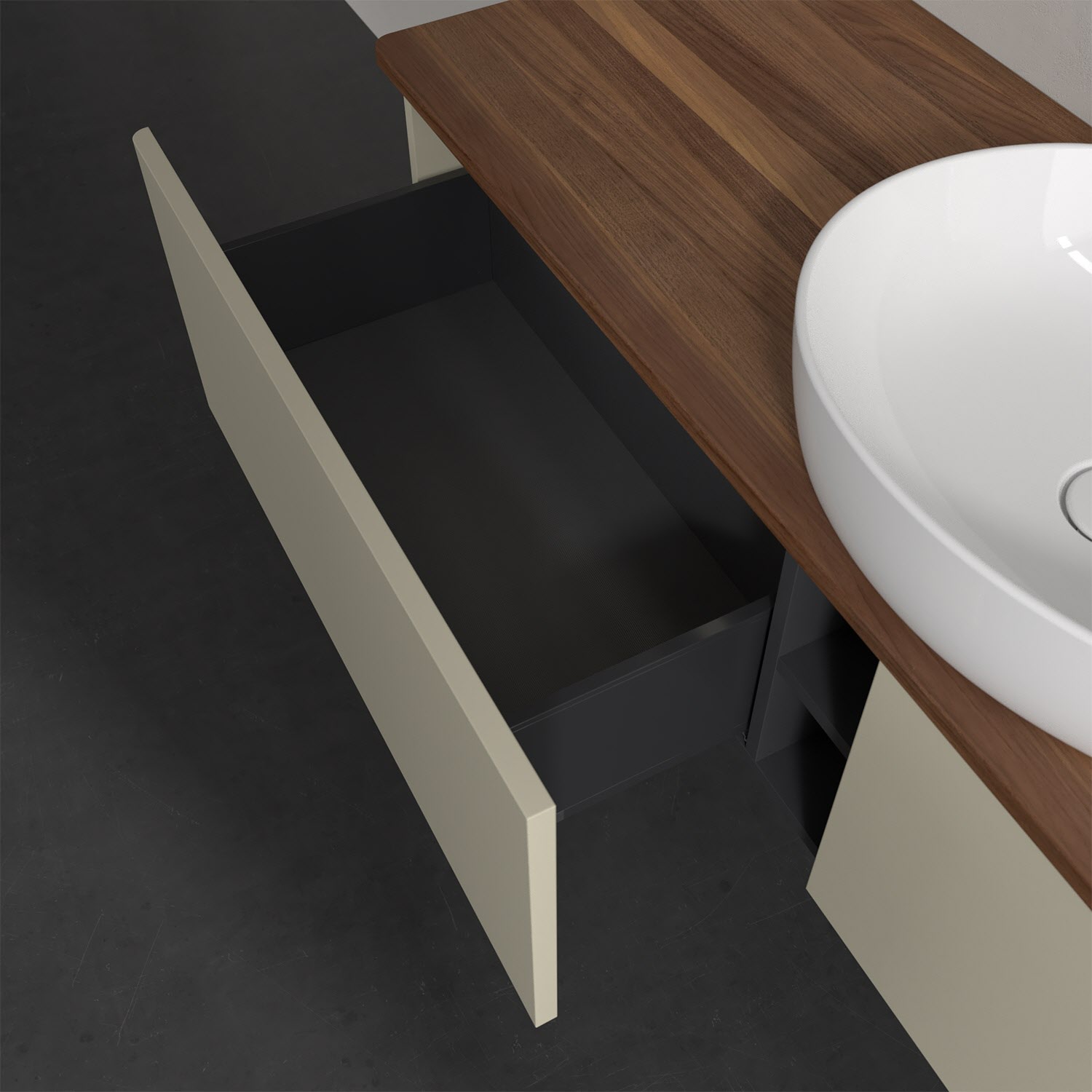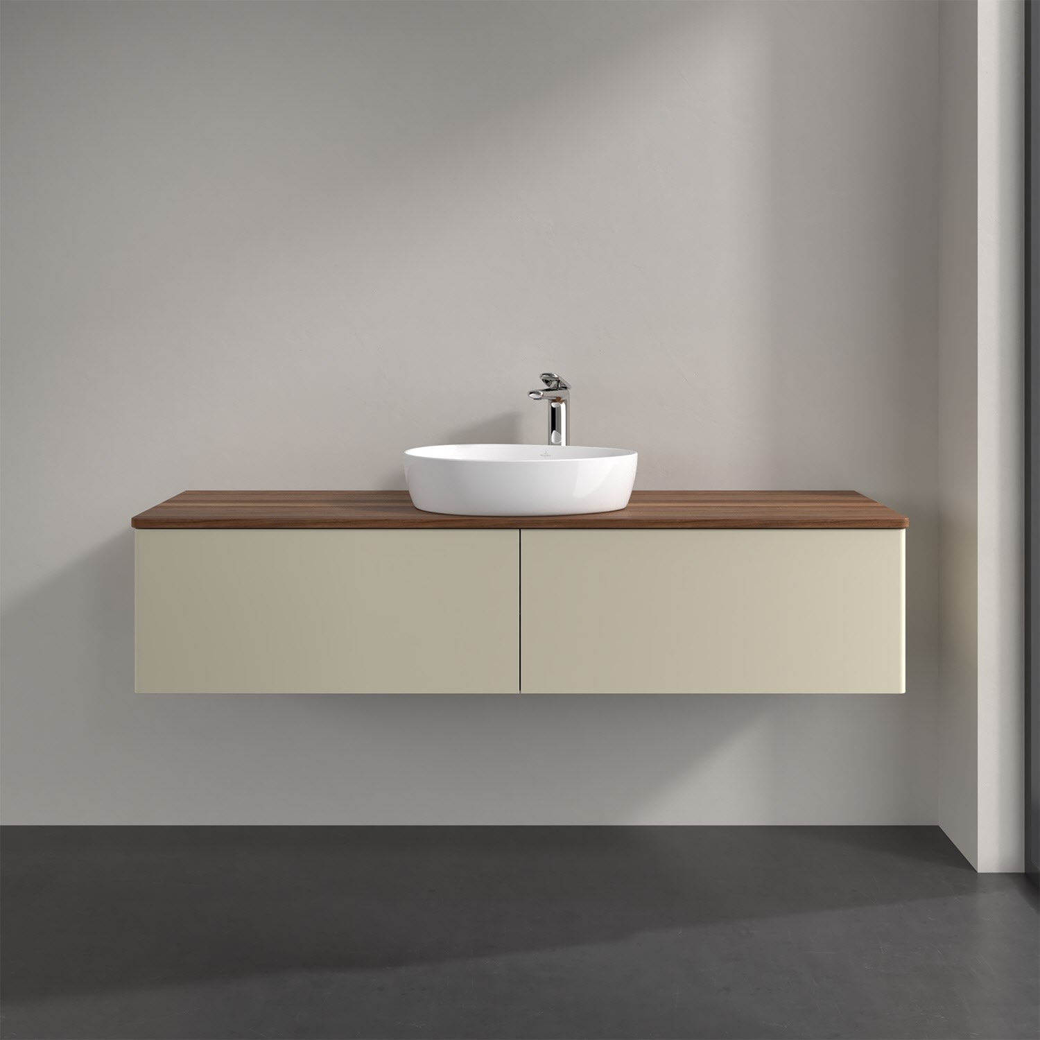 Für diesen Waschbeckenunterschrank stehen Ihnen Aufsatzwaschtische aus verschiedenen Serien zur Verfügung (siehe "Passliste" unter Downloads). Ein ausgewähltes Beispiel finden Sie im Zubehör. Den Waschtisch bitte separat mitbestellen.