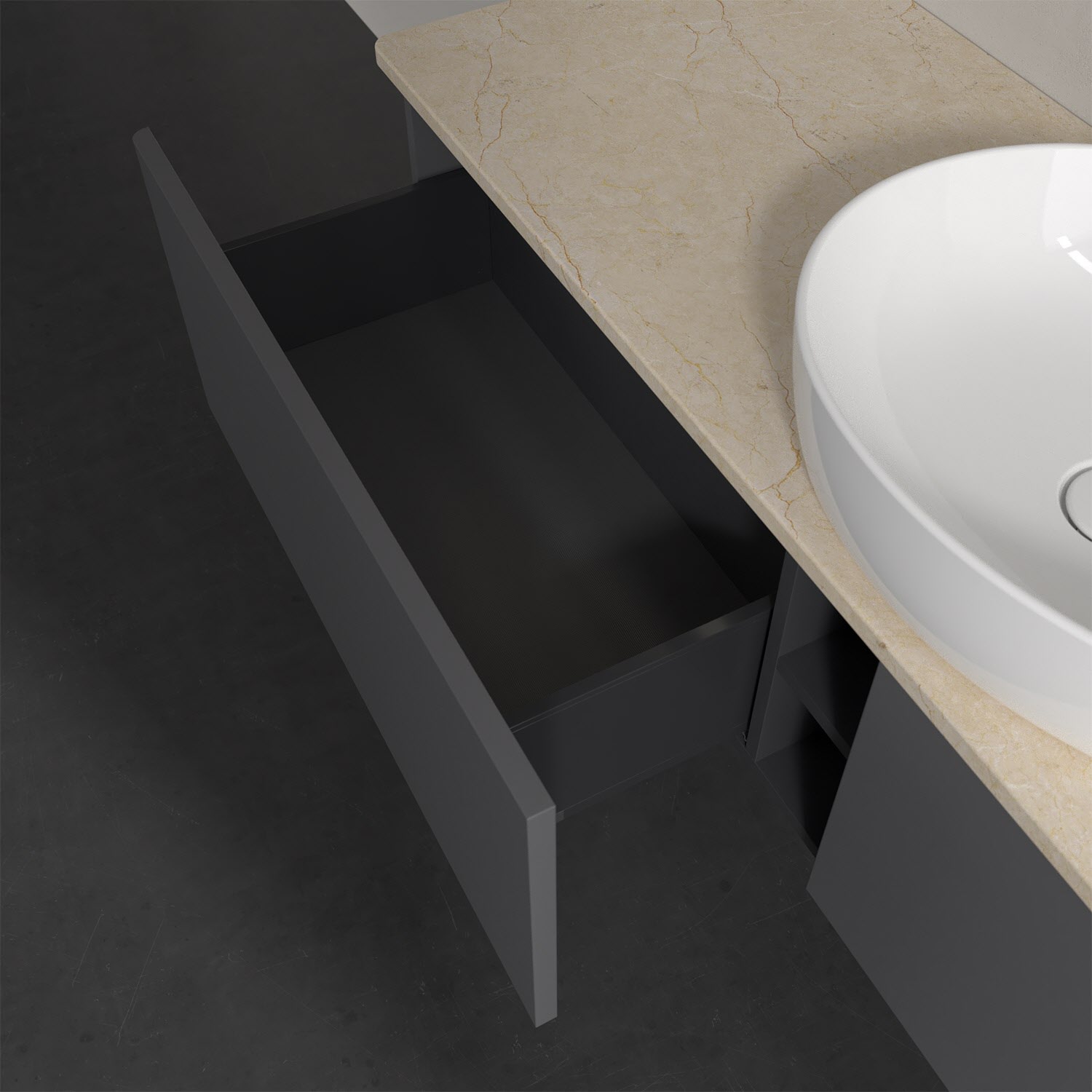 - kein Umfallen oder Verrutschen von Pflegeprodukten in den Schubladen dank rutschhemmendem Boden