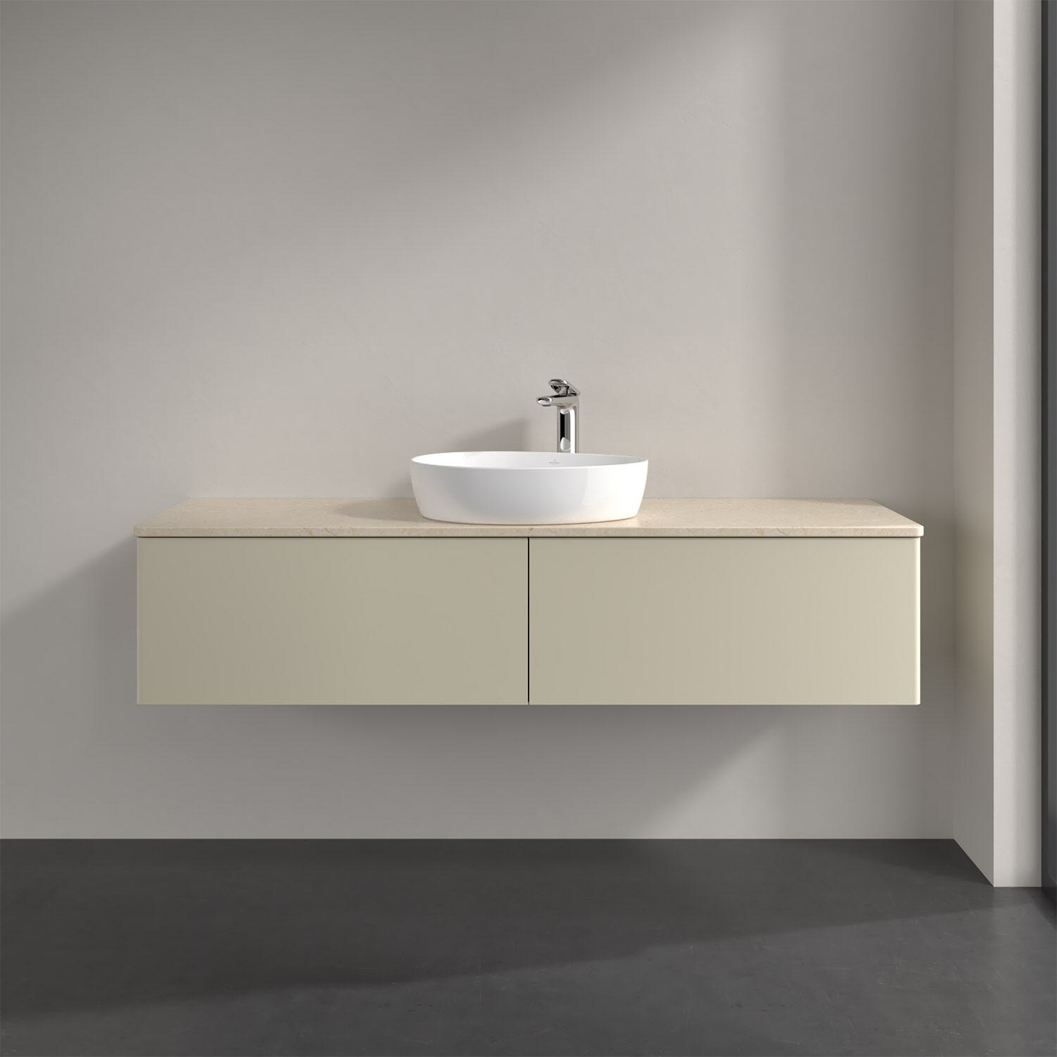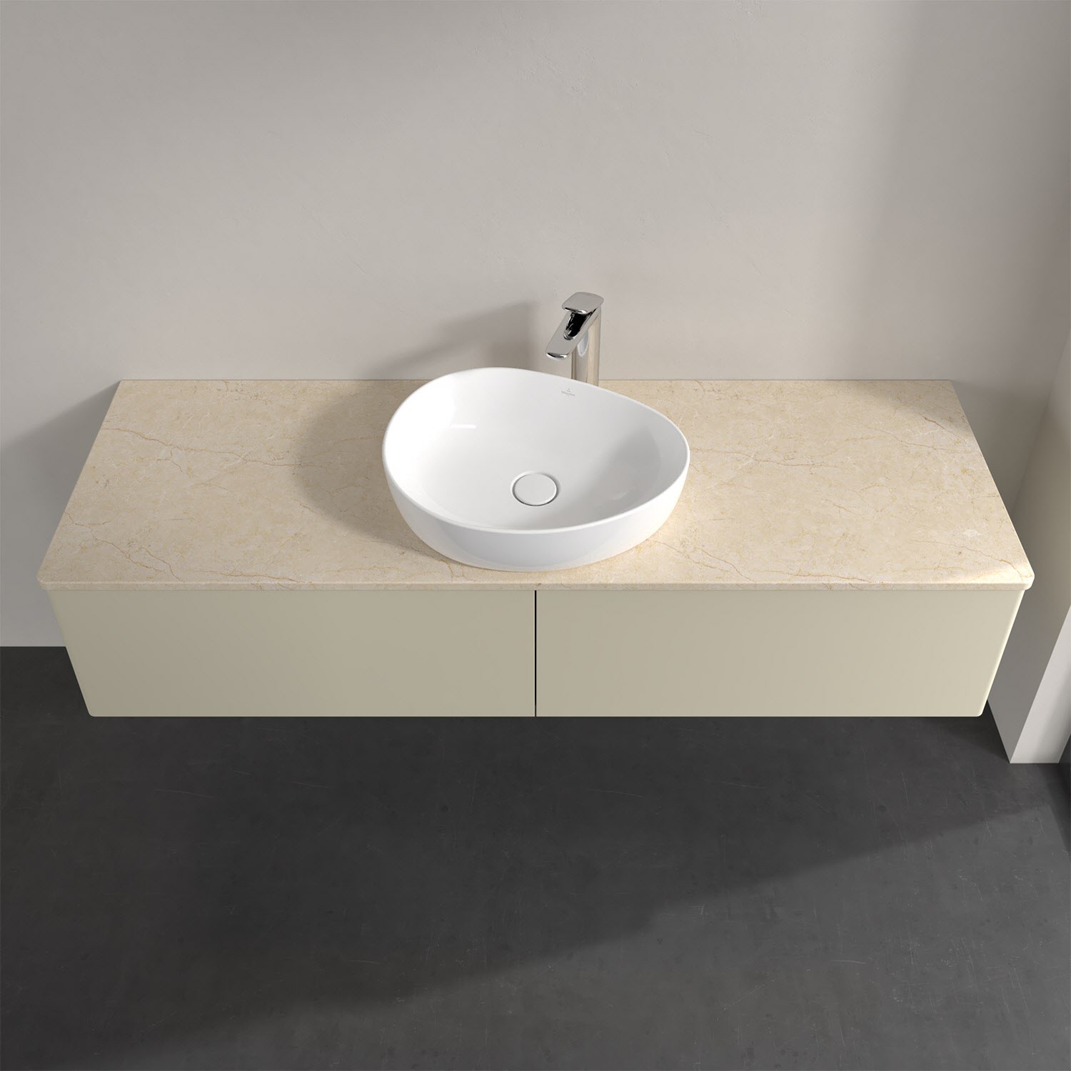 Für diesen Waschbeckenunterschrank stehen Ihnen Aufsatzwaschtische aus verschiedenen Serien zur Verfügung (siehe "Passliste" unter Downloads). Ein ausgewähltes Beispiel finden Sie im Zubehör. Den Waschtisch bitte separat mitbestellen.