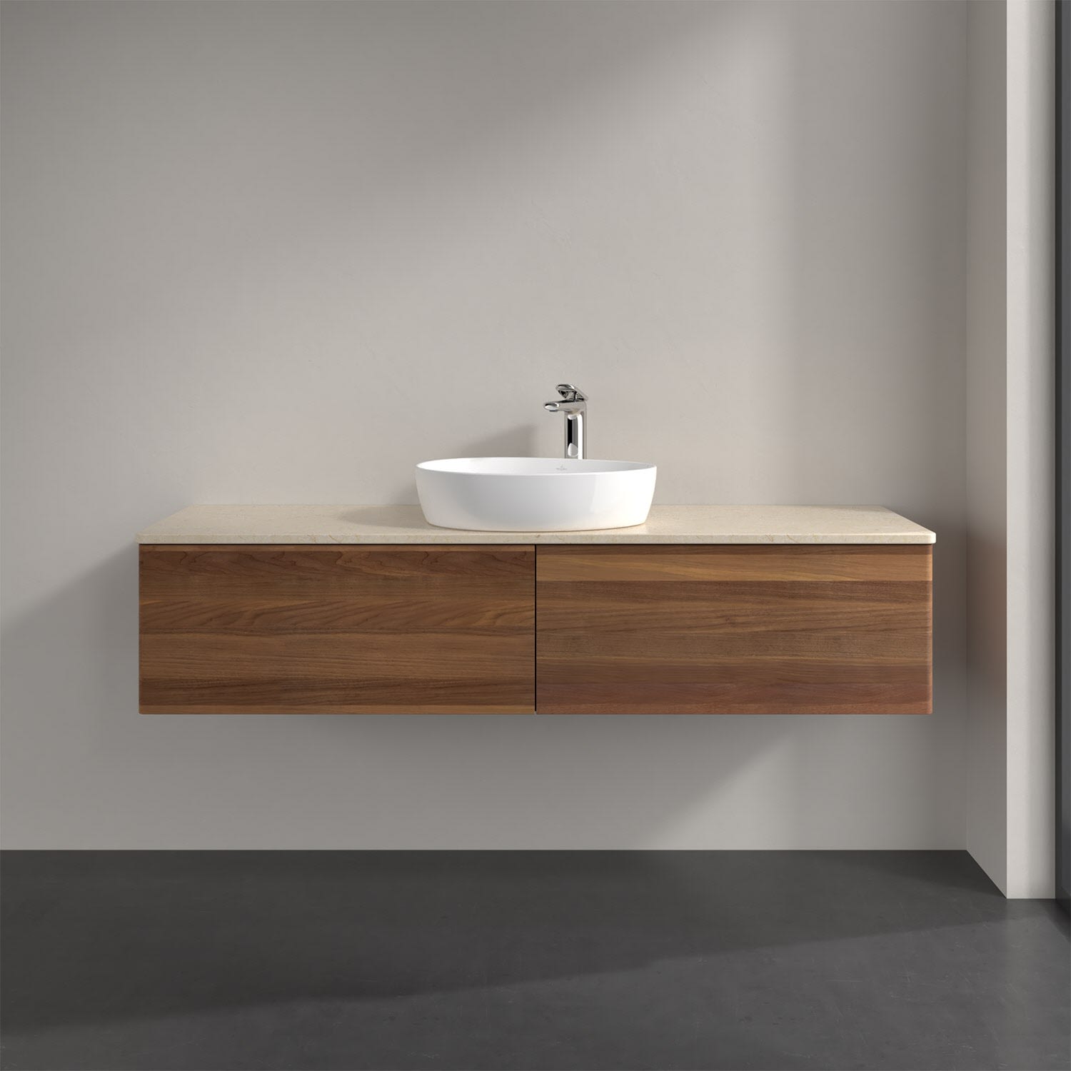 Für diesen Waschbeckenunterschrank stehen Ihnen Aufsatzwaschtische aus verschiedenen Serien zur Verfügung (siehe "Passliste" unter Downloads). Ein ausgewähltes Beispiel finden Sie im Zubehör. Den Waschtisch bitte separat mitbestellen.