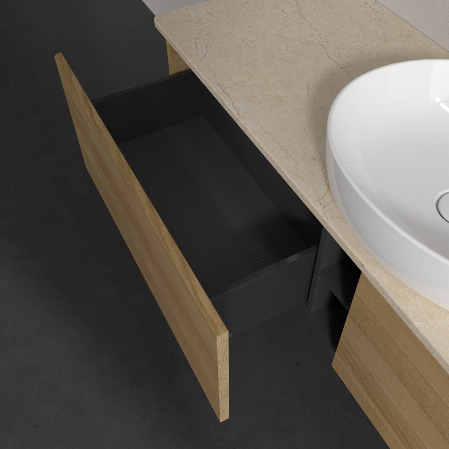 Für diesen Waschbeckenunterschrank stehen Ihnen Aufsatzwaschtische aus verschiedenen Serien zur Verfügung (siehe "Passliste" unter Downloads). Ein ausgewähltes Beispiel finden Sie im Zubehör. Den Waschtisch bitte separat mitbestellen.