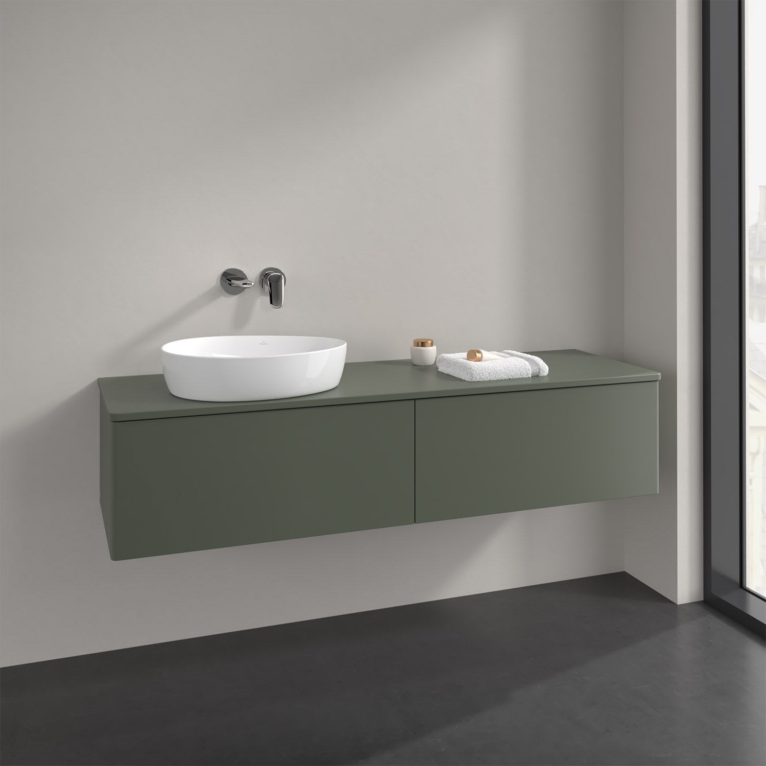 Der wandhängende Antao Waschtischunterschrank bietet mit seinen beiden extra hohen Auszügen und seiner erstaunlichen Größe viel Platz zum Verstauen von Utensilien im Badezimmer. Dank des seitlich platzierten Aufsatzwaschtischs gibt es daneben weiteren Platz für Handtücher, Seifenspender & Co. auf der Waschtischplatte. Inspiriert von der Natur überzeugt der Unterschrank auch optisch mit sanfter Formsprache und abgerundete Kanten. Die grifflosen Auszüge sind mit der Push-to-Open Funktion ausgestattet und verfügen über einen Antirutschboden, damit Utensilien sicher verstaut werden können. Den Überblick behält man dank der warmweißen Auszugsbeleuchtung, die sich automatisch beim Öffnen einschaltet. Mit seiner Vollauszug- und Selbsteinzug-Funktion ist der Schrank praktisch und leicht zu bedienen. Qualität von Villeroy & Boch! Für eine besonders leichte Pflege sorgt die mehrschichtig deckend lackierte Oberfläche.