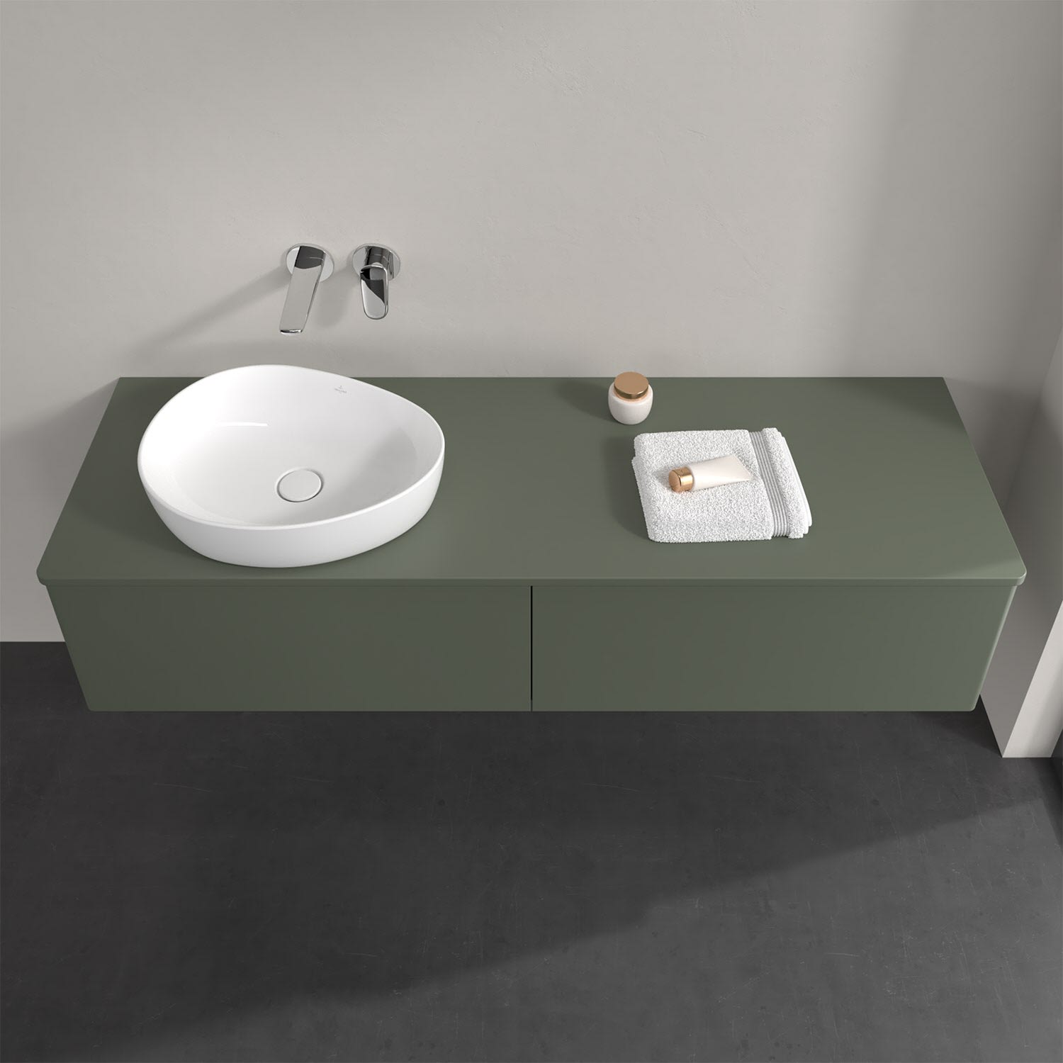 Für diesen Waschbeckenunterschrank stehen Ihnen Aufsatzwaschtische aus verschiedenen Serien zur Verfügung (siehe "Passliste" unter Downloads). Ein ausgewähltes Beispiel finden Sie im Zubehör. Den Waschtisch bitte separat mitbestellen.