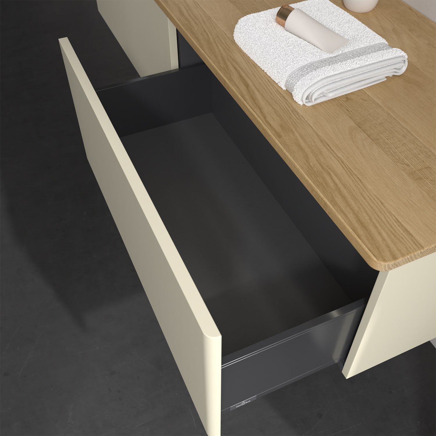 Der wandhängende Antao Waschtischunterschrank bietet mit seinen beiden extra hohen Auszügen und seiner erstaunlichen Größe viel Platz zum Verstauen von Utensilien im Badezimmer. Dank des seitlich platzierten Aufsatzwaschtischs gibt es daneben weiteren Platz für Handtücher, Seifenspender & Co. auf der Waschtischplatte. Inspiriert von der Natur überzeugt der Unterschrank auch optisch mit sanfter Formsprache und abgerundete Kanten. Die grifflosen Auszüge sind mit der Push-to-Open Funktion ausgestattet und verfügen über einen Antirutschboden, damit Utensilien sicher verstaut werden können. Den Überblick behält man dank der warmweißen Auszugsbeleuchtung, die sich automatisch beim Öffnen einschaltet. Mit seiner Vollauszug- und Selbsteinzug-Funktion ist der Schrank praktisch und leicht zu bedienen. Qualität von Villeroy & Boch! Für eine besonders leichte Pflege sorgt die mehrschichtig deckend lackierte Oberfläche. Bei der Ausführung in Massivholz wird dank des verarbeiteten Massivholzes jedes Möbel zu einem Unikat, das sich durch das lebendige Naturmaterial durch seine einzigartige Struktur und Maserung auszeichnet.