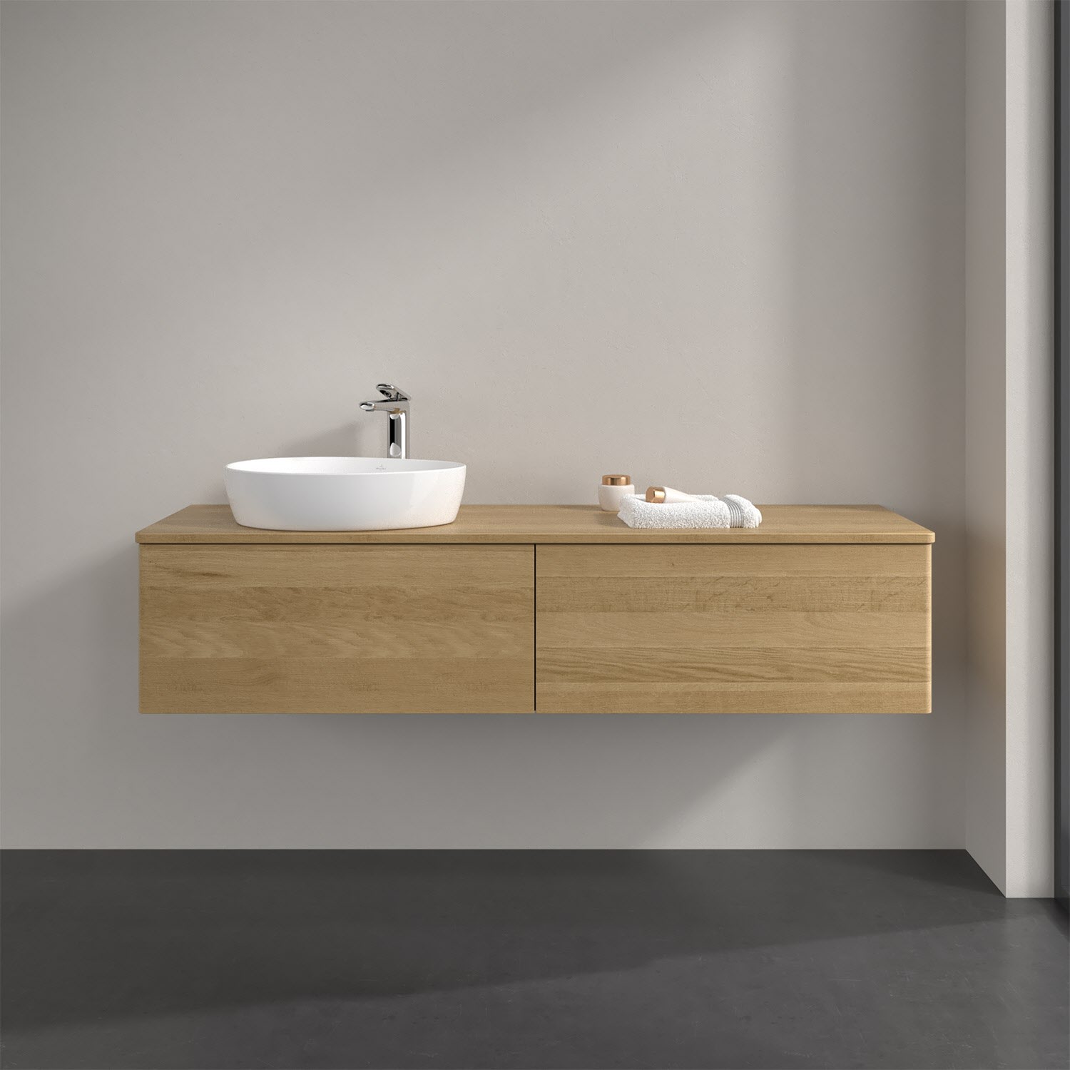 Der wandhängende Antao Waschtischunterschrank bietet mit seinen beiden extra hohen Auszügen und seiner erstaunlichen Größe viel Platz zum Verstauen von Utensilien im Badezimmer. Dank des seitlich platzierten Aufsatzwaschtischs gibt es daneben weiteren Platz für Handtücher, Seifenspender & Co. auf der Waschtischplatte. Inspiriert von der Natur überzeugt der Unterschrank auch optisch mit sanfter Formsprache und abgerundete Kanten. Die grifflosen Auszüge sind mit der Push-to-Open Funktion ausgestattet und verfügen über einen Antirutschboden, damit Utensilien sicher verstaut werden können. Den Überblick behält man dank der warmweißen Auszugsbeleuchtung, die sich automatisch beim Öffnen einschaltet. Mit seiner Vollauszug- und Selbsteinzug-Funktion ist der Schrank praktisch und leicht zu bedienen. Qualität von Villeroy & Boch! Für eine besonders leichte Pflege sorgt die mehrschichtig deckend lackierte Oberfläche. Bei der Ausführung in Massivholz wird dank des verarbeiteten Massivholzes jedes Möbel zu einem Unikat, das sich durch das lebendige Naturmaterial durch seine einzigartige Struktur und Maserung auszeichnet.